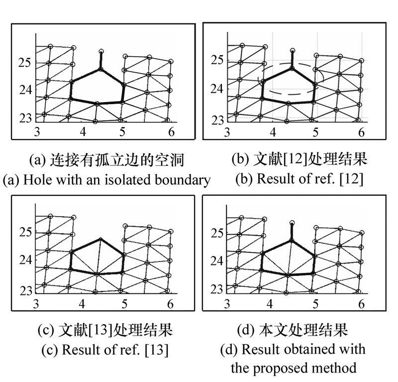 To solve the hole-problem of the reconstructed surface in three dimensional laser scanning system, the hole-recognition and repair method based on the Floyd shortest path selection algorithm is proposed.We process one by one all the boundary points of the three dimensional surface which might constitute a hole, and adopt the tree search algorithm to obtain the boundary points, which are directly or indirectly connected to the processed point, and use them as the routing nodes, then the boundary sides which are connected with the nodes are used as the routing sides, and we set the length of the boundary sides according to the search level of the nodes.When the newly searched boundary point overlap with the already searched points, we firstly process the distance matrix and the routing matrix to find the hole endpoint by the Floyd algorithm, and then make use of the repeated point and the hole endpoint to generate the hole boundary sides set.Finally, we deal with the hole boundary sides set using the wave front method.The experimental results show that the proposed method can accurately identify the special hole-structures, such as a hole connected with an isolated boundary side and two adjacent holes, and has better versatility and robustness compared with the traditional method.Compared with two traditional methods, the number of the repaired holes has been increased by 54.1% and 21.3%, respectively.
