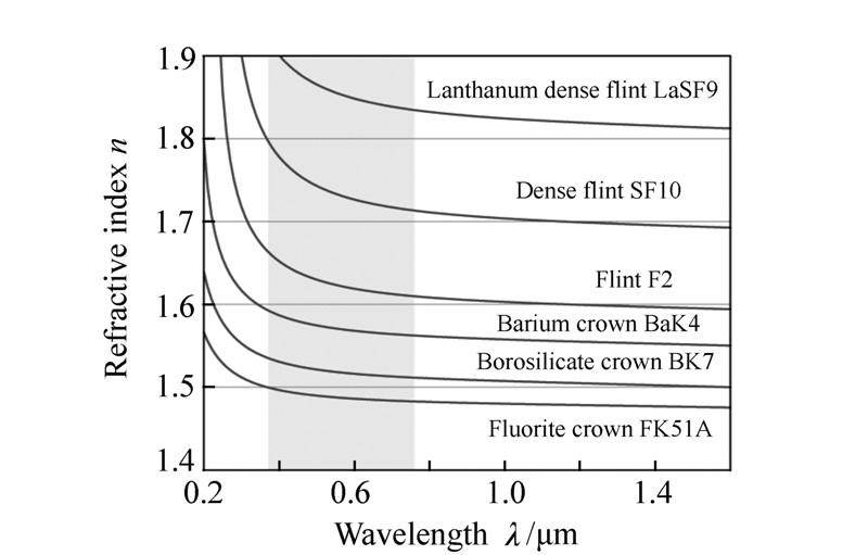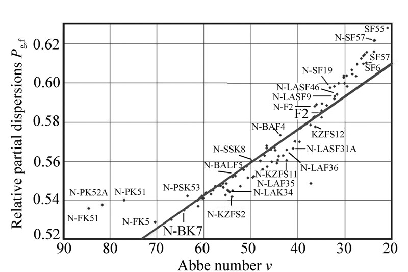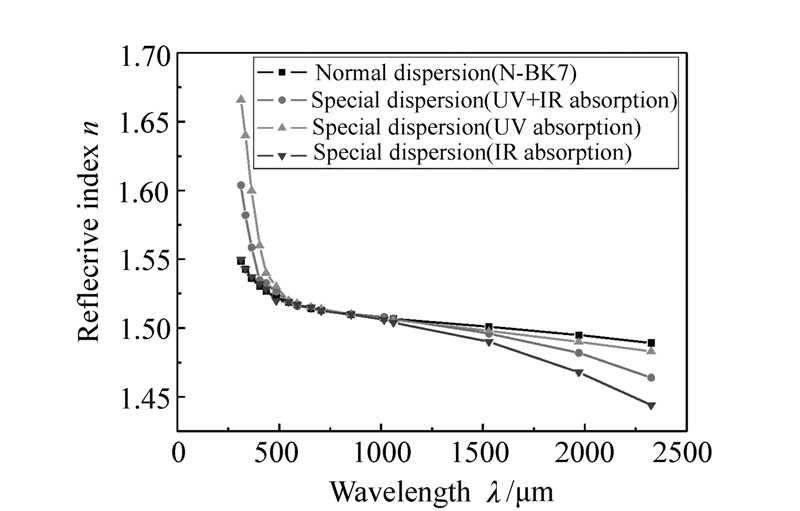 Special dispersion mechanism of optical glass is studied deeply in ths paper.The deviation of relative partial dispersion ΔPg, F from normal line is an important parameter to characterize the special dispersion property of optical glass.The optical glass with high absolute value of ΔPg, F can be used to revise secondary spectrum in advanced optical system.The special dispersion phenomenon in visible region is aroused by inherent absorption in the ultraviolet and infrared regions.The shift and strength of inherent absorption peaks have an evident influence on the slope of dispersion curve, which will change the deviation of relative partial dispersion.It is generally thought that the electron transition results in ultraviolet inherent absorption, and libration of molecule or its group leads to infrared inherent absorption.Special dispersion mechanism is studied not only to deeply understand the relationship among composition, microstructure and property of optical glass, but also to develop new optical glasses with more excellent special dispersion property.