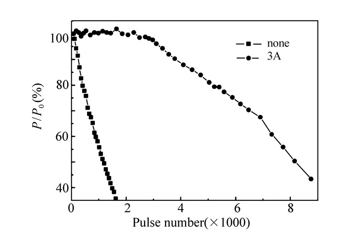The de-excitation effect of ground state DF molecules after dicharge of no-chain pulsed DF laser to excited DF molecules is an important cause for laser's steady working. In order to solve this problem, molecular sieves of 3A and 5A were respectively used as the adsorbent for experiments. Without molecular sieve, the laser output power decreased to 56% of initial power after 1 000 repetitive pulses. After 3A and 5A molecular sieve being utilized, the decrease of laser power were less than 20% after 5 000 and 6 800 shots respectively, so the stability of the laser has been greatly improved. The results show that the adsorptive efficiency of 5A molecular sieve is higher than that of 3A molecular sieve. And these two molecular sieves adsorbed not only the ground DF molecules, but also reacting gas. So the stability of laser can be improved by supplementing of reacting gas timely.