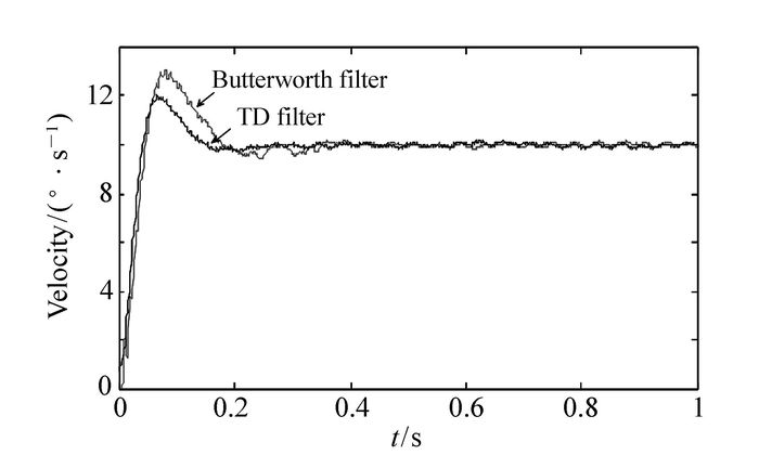 In order to improve the aviation optical axis stabilization accuracy of the photoelectric stabilized platform, we use tracking differentiator as filter to decrease the negative effects of random noise on the control accuracy. on the basis of the filtered signals and their differentiated signals, the phase delays after being filtered are compensated by predicting. This algorithm is model-independent and easy to implement with small calculation. In this paper, the discrete mathematics of the algorithm is described, and the numerical simulation and experimental verification are conducted and applied to the photoelectric stabilized platform for aviation. The results show that the tracking differentiator, compared with the Butterworth filter, can improve the performance of the step response, shorten the maximum overshoot by 10.5%, cut down the rise time by 4.5 ms, shorten the setting time by 50 ms. The simulation and experiment proved the validity and practicability of the algorithm. It can meet the system requirements for real time, higher precision and rapid speed, as well as strong anti-jamming and stabilization. It also indicates that the tracking differentiator provide good value for the improvement of the precision of the photoelectric stabilized platform for aviation.