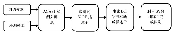 To improve the real-time performance and the accuracy of the SURF algorithm, an algorithm combined with AGAST corner detector and improved SURF feature descriptor is proposed. Firstly, feature points are detected by using AGAST corner detection template. Secondly, the Haar wavelet response with increased diagonal information is used to generate descriptor of feature points. Then, the generated descriptor is encoded by the feature bag and a new feature vector is generated. At last, the classification is fulfilled by Support Vector Machine(SVM). Finally, SVM is used to classify the feature vectors to complete the detection. Detection experiments for different view-points, illumination and scales are conducted respectively using SIFT and SURF algorithm as a control. The results show that the average detection rate of this algorithm is 98.0%, 96.9% and 97.1%, and the average time is 66.1 ms, 79.3 ms and 41.0 ms, respectively, which is better than that of SURF algorithm, and the time consumption is about 1/3 of the SURF algorithm.