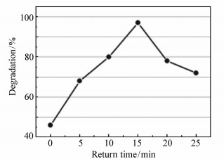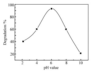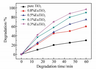 Eu-doped nano-TiO2 photocatalyst emulsion has been prepared by a novel complexation-controlled hydrolysis method at room temperature using TiCl4, organic carboxylic acid, NH3·H2O, europium nitrate and D-sorbitol etc. as experimental raw materials. The acid red 3R dye was taken as the degradation product, and the photocatalytic performance of TiO2 photocatalyst emulsion prepared under different irradiation effects through the irradiation of solar simulator was investigated. In addition, the photocatalytic performance of Eu-doped nano-titanium dioxide photocatalyst emulsion for different concentrations of dyes was studied. The photocatalytic activity of Eu-doped nano-titanium dioxide photocatalyst was studied by the degradation experiment of acid red 3R dye. The phase structure, particle size, and absorption spectrum of samples were characterized by X-ray diffraction(XRD), nano-laser particle size analyzer and UV-visible spectrophotometer(UV-Vis), respectively. The results show that the average particle size of the sample is about 4.1 nm, the crystal form is anatase, and the absorption spectrum of the sample can be widened to the visible region. The best photocatalytic activity of prepared Eu-doped nano-TiO2 photocatalyst emulsion is shown when the doping content of Eu is 0.3%, pH value is 6 and the reflux time is 15 min. After being irradiated by sunlight for 1 h, the photocatalyst emulsion has the highest degradation efficiency of over 97% for acid red 3R model reactant with a concentration of 25 mg/L.