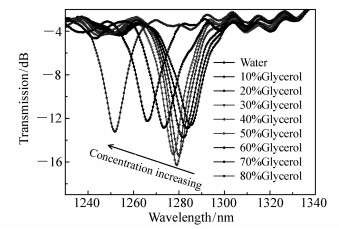 In this paper, a type of refractive index sensor based on a single end face long period fiber grating(LPFG) with transmission spectra is designed. First, an optical fiber joint at the input end of a 2×2 single-mode fiber coupler is connected with the light source, and the two optical fiber joints at the output end are connected with an optical spectrum analyzer and an optical fiber joint of LPFG respectively. Then, the reflective silver film is sputtered on the other end face of the optical fiber containing LPFG. Finally, a series of glycerol aqueous solutions with different refractive indices are used as the liquid medium to be measured to investigate the similarities and differences between the response spectra of LPFG in direct transmission mode and the single-end silver film mode. The experimental results show that although the single end face is adopted, the corresponding response spectra of LPFG is still in the form of transmission spectra. Moreover, for the same liquid, LPFG with the single end face silver film and LPFG in the direct transmission mode have nearly the same resonance wavelength value. However, there is a certain difference between their optical losses. In the 0~80% glycerol solutions, the optical loss in direct transmission mode changes from -12.92 dB to -16.28 dB and then gradually to -13.22 dB. However, the optical loss gradually changes from -13.13 dB to -13.74 dB and then to -11.45 dB in the case of the single end face silver film mode. Compared with the direct transmission mode, there is a better linear relationship between the relative optical loss and the glycerol concentration of LPFG based on a single end face silver film. The LPFG measurement system designed in this study uses a single end face probe to detect the environmental medium, making it more flexible and convenient in measurement. It is well suited for refractive index measurement in long-distance, harsh environments or deep liquid environments.