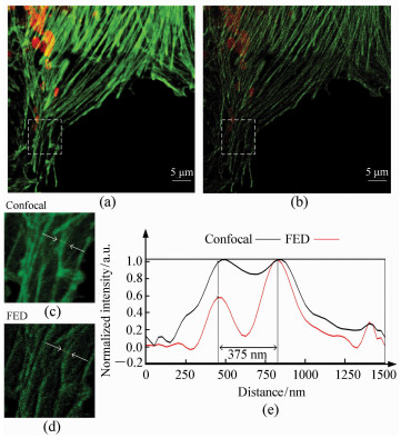 To perform super-resolution imaging of different tissue structures of biological samples using fluorescence radiation differential microscopy simultaneously, a dual-color FED microscopy system is studied in this paper. The basic principle of the FED is to remove the confocal microscopy image obtained by scanning the solid spot from the confocal microscopy image obtained by scanning the hollow spot to obtain a super-resolution microscopy image. Based on the study of the monochromatic FED microscopy system, a feasible dual-color FED microscopy imaging system is proposed and imaging experiments are performed on fluorescent particles in this paper. The experimental results indicate that under excitation light of 488nm and 640nm, the system realizes spatial resolution of 135 nm and 160 nm of the fluorescent particles respectively. In addition, this system can also perform multi-color super-resolution microscopy imaging simultaneously on different tissues of biological samples, which meets the requirements of practical applications.