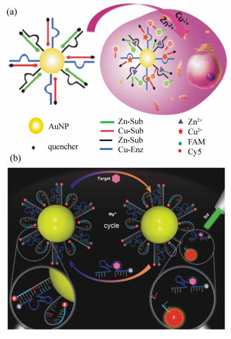 Nucleic acid is a substance that carries genetic information. It exists either in nature or can be synthesized by established techniques. Nucleic acid sequences with special functions, such as aptamers and DNAzymes, can also be selected using in vitro techniques. Nucleic acids hybridize according to the principle of Watson-Crick base pairing, and have strong specificity. Whether through sequence design or in vitro screening, nucleic acid probes play an important role in the analysis and imaging applications of biomarkers. In addition, nanomaterials can be used to construct nucleic acid functionalized nanoprobes, which can protect the loaded nucleic acids from being degraded by nucleases and can enter cells without the aid of the transfection reagents. Therefore, nanomaterials have great advantages in the application of cell fluorescence imaging. In order to solve the problem of low intracellular biomarker content and thus difficult to detect, a variety of imaging signal amplification methods suitable for the cellular level have been developed to achieve highly sensitive imaging of low-abundance biomarkers. In this paper, the application of nucleic acid functionalized nanoprobes in cellular fluorescence imaging, including antisense oligonucleotide functionalized nanoprobes, aptamer functionalized nanoprobes and DNAzyme functionalized nanoprobes and that in imaging signal amplification are reviewed.