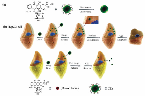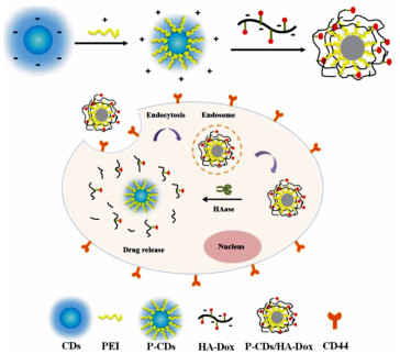 Fluorescent carbon dots have the advantages of good chemical stability, low toxicity, and surface functionalization, which has caused concern. In recent years, polymer carbon dots synthesize by polymer polysaccharides have become a new research hotspot. In this paper, a chitosan-based fluorescent polymer carbon dot material is synthesized by hydrothermal method and used for drug-loading research. We choose chitosan-graft-polyethylene glycol monomethyl ether and citric acid derivatives as the carbon sources for the carbon dots, because chitosan and polyethylene glycol are both a carbon source for carbon dots and a passivation reagent for carbon dots. Then the quantum yield of the polymeric carbon dots is increased. Polymer carbon dots can also retain the molecular structure of polyethylene glycol and chitosan, providing favorable conditions for its application in drug loading. The structural characterization is performed on P(CS-g-mPEG-CA)CDs by IR, UV, X-ray diffraction, photoelectron spectroscopy, transmission electron microscopy and photoluminescence spectra and pH stability test is carried out. The results show that the synthesized P(CS-g-mPEG-CA)CDs has higher fluorescence quantum yield(66.81%), longer fluorescence lifetime(15.247 ns), and better pH stability. Using Doxorubicin as a model drug, a load study was conducted using this polymer carbon dot. The results show that if the degree of substitution of mPEG is 11.9%, the maximum loading rate of polymer carbon dots is 51.3% and the maximum drug release rate is 28.7%. In addition, we also found that drug loading and release could be controlled by the grafting rate of mPEG. In addition, the cytotoxicity of polymer carbon dots on nasopharyngeal carcinoma cells(CNE-2) is evaluated using an MTT assay. The study shows that there is no obvious cytotoxicity of blank P(CS-g-mPEG-CA)CDs, and that the survival rate of CNE-2 cells decreases with the increase of drug-loaded micelles. The results show that the P(CS-g-mPEG-CA)CDs have a certain application prospect in the aspects of fluorescence labeling, drug delivery, fluorescent tracer system and controlled release.