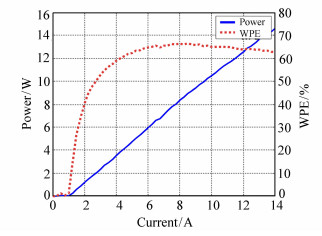 In this paper, a high efficiency and high reliability 915 nm semiconductor laser is designed and fabricated, which is a key component of the fiber lasers. In order to maximize the electro-optic conversion efficiency of the device, a double asymmetric large-cavity waveguide structure is adopted in the design, and the quantum well structure, waveguide structure, doping, and device structure are systematically optimized. Device simulations show that the device's maximum electro-optical conversion efficiency reaches 67% at an ambient temperature of 25℃. The material is grown by Metal Organic Chemical Vapor Deposition(MOCVD), and a laser chip having a light emitting region width of 95 μm and a cavity length of 4.8 mm is prepared. Tests show that the efficiency of the packaged device and other parameter indices have reached the advanced level of similar devices in the world. In the case that the threshold current is 1 A at room temperature, the slope efficiency is 1.18 W/A, the maximum electro-optic conversion efficiency is 66.5%, the output power is 12 W, and the electro-optical conversion efficiency reaches 64.3%. It can be seen that the test results are in good agreement with that of the device theory simulation. After approximately 6 000 hours of long-life accelerated testing, the device power does not attenuate, indicating that the produced high-power 915 nm laser chip has very high reliability.