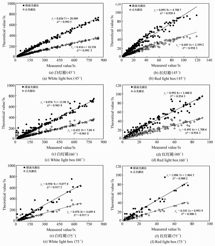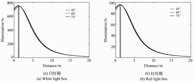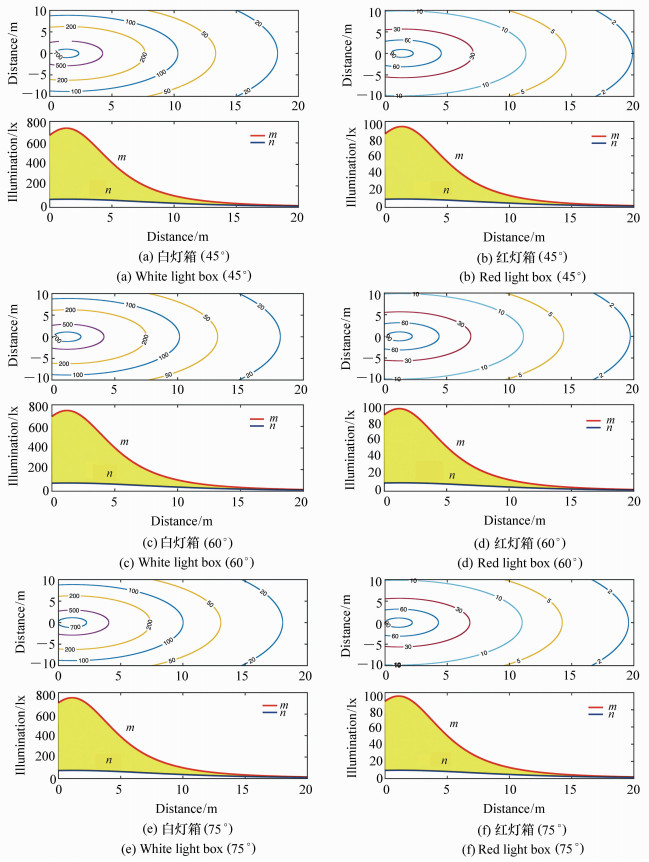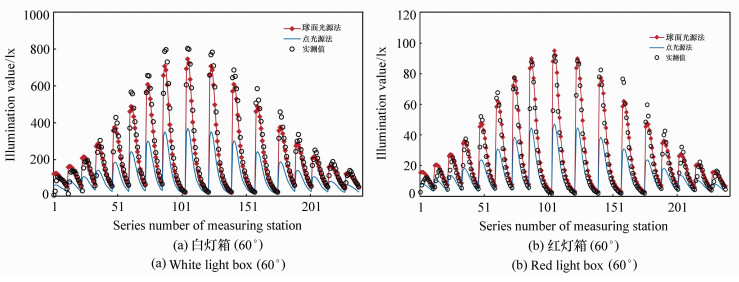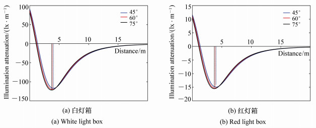Fishing lamps are an important piece of equipment in light fishing, such as the fishing of Pacific Saury. In this paper, a lamp for fishing saury was used as an example to establish a theoretical model of illumination for single light boxes using the point source method and the spherical source method, respectively. It was found by comparing the theoretical values and measured values of plane illuminance that the linear fitting slope coefficient using the spherical source method was closer to 1 than that using the point source method. There was no significant difference between the calculated theoretical value based on spherical light source method and its measured value(P>0.05). However, a significant difference was found between the theoretical value obtained by the point light source method and its measured value(P < 0.05), indicating that the illuminance model using the spherical light source method was more consistent with its actual illumination. The illuminance distributions of white and red single light box at 45°, 60° and 75° angles of inclination were calculated according to the spherical light source model. The results showed that the illuminance value increased at first and then decreased with an increase in distance, and that the illuminance distribution of different lamp colors at the same angle were quite different. The illuminance value of a white light box was obviously higher than that of red light box at the same position, but the illuminance distribution of the same lamp color at different angles were less different. The distance from the maximum illuminance value to its origin gradually decreased as the angle increased. The decay rate of illumination decreased first, then increased and then decreased again with an increase in distance, before it finally approached 0.
