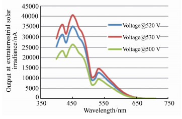 According to the optical beam superposition principle, a set of linearity measurement devices of spectrometer photoelectrical detecting system was developed. It consists of a 300 W super-quiet xenon lamp, a 250 W halogen tungsten lamp, a neutral filter group, double apertures and optical imaging system. The radiant power of the optical beams is manipulated with neutral filters and optical beam superposition is achieved using double apertures and optical imaging system. The spectral range of this device is 200-2 400 nm and the dynamic range of the linearity measurement is 104. It can simulate the extraterrestrial solar spectral irradiance and can be used for measuring linearity in solar spectrometer photoelectrical systems and silicon photodiode standard detection.