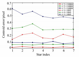 Under the dynamic working conditions for a star sensor, motion blur will appear in a star because of its energy dispersion in the process of imaging, which leads to a decrease in the signal to noise ratio(SNR) and makes the blurred region difficult to extract. Meanwhile, this causes a degradation in star centroid positon accuracy and attitude accuracy in the star sensor. Therefore, a restoration method for blurred star images based on region filters is presented in this paper, which simultaneously concentrates on the improvement of SNR and star centroid accuracy. Firstly, the kinematic models of a star centroid under different conditions are set up based on the characteristics of star sensors. Secondly, the motion trail of star centroid is determined based on the kinematic model, allowing the star blurred region to be extracted. The images inside and outside the star blurred region are then preprocessed by image processing algorithm respectively. Finally, the blurred star image is restored by an image restoration algorithm. The experiment results indicate that under the dynamic condition of 2°/s, the region filter algorithm can effectively improve the SNR of a blurred star image. In restored images, the error of star centroid is less than 0.1 pixels, which can satisfy the requirements for star sensor of high centroid accuracy.