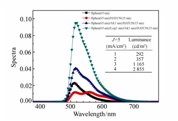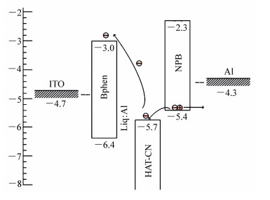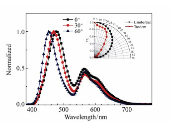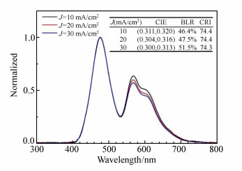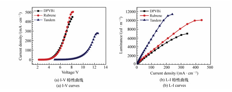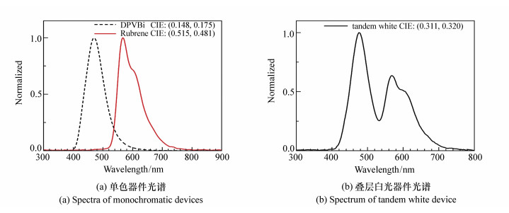 A charge generation layer(CGL) of Liq/Al/HAT-CN is used to fabricate the blue-yellow complementary tandem white organic light-emitting device. A group of dual-color devices are used to illustrate the working mechanism of CGL, and Liq/Al structure in the CGL is further studied. Under the current density of 10 mA/cm2, the operating voltage(8.3 V) and luminance(746 cd/m2) of the tandem device are both approximately the sum of those of blue device(4.2 V, 315 cd/m2) and yellow device(4.2 V, 426 cd/m2), respectively, confirming that the charge generating layer is effective. The maximum brightness of 11 420 cd/m2 is obtained at the current density of 240 mA/cm2, and the current efficiency and power efficiency are 7.2 cd/A and 2.6 lm/W under the luminance of 1 000 cd/m2, respectively. When driving current density increases from 10 mA/cm2 to 30 mA/cm2, the ratio of blue light in spectra increases by 5%, which means the stable performance of device. In view of the weak microcavity effect existing in the tandem device, we conducted in-depth research by optical simulation based on the microcavity theory. The simulation results are highly consistent with the actual spectra, demonstrating the accuracy of optical simulation calculation.