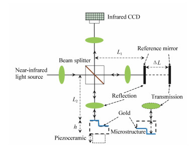 The bottom and sidewall profile reconstruction of microstructures with a high aspect ratio is a problem that urgently needs to be solved in the field of MEMS(Micro-Electro-Mechanical system). Microstructures profile reconstruction method is presented based on near-infrared light transmission reflection interferometry with optical path compensation(OPC), which is extended from white light to near-infrared light and from reflection interference to transmission interference. The near-infrared light transmission interferometry system is composed of a near-infrared light source, an interference microscope, an infrared light CCD, piezoelectric ceramics with high accuracy and a data acquisition system. A GaAs sample microstructure with two steps was designed and the method of vertical scanning interference of near-infrared light with OPC was adopted to reconstruct the internal profile of a microstructure, which was then compared with the results of scanning electron microscopy(SEM). Test results show that the relative heights of the measured microstructure steps using near-infrared light transmission reflection interferometry were 2.132 μm and 0.766 μm with 2.16% and 2.68% relative errors, respectively, which agree with the results of SEM and that of the near-infrared light reflection interferometer. The measurement system has the ability to reconstruct the bottom and sidewall profile of microstructures with a high aspect ratio.