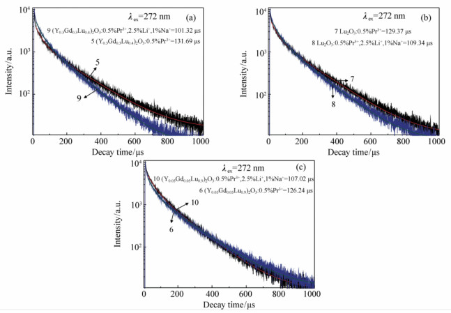 Li+, Na+ co-doped (YxGdyLu1-x-y)2O3:0.5%Pr3+ phosphors were synthesized with a high temperature solid-state reaction. The structures of the samples were characterized by XRD. The excitation spectra, emission spectra and fluorescence lifetime of the samples were measured and analyzed using a fluorescence spectrophotometer. The results show that they are still the cubic phase of the matrix for Li+, Na+, doped (YxGdyLu1-x-y)2O3:Pr3+ samples. The doping of Li+ and Na+ in a single matrix can effectively improve the grain size while the doping of Li+ and Na+ in a composite matrix not only effectively improves the grain size, but also causes the sample to become ceramic. Under excitation at 272 nm, the powder samples present strong red emissions of Pr3+ at 632 nm. Under different conditions, (Y0.05Gd0.05Lu0.9)2O3:0.5%Pr3+, 2.5%Li+, 1%Na+ fluorescent powder obtained by calcination at 1 000℃ for two hours has the strongest luminescence, while the lifetime of the sample is shorter.