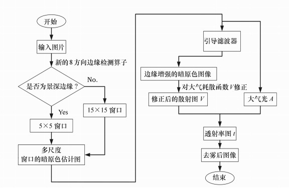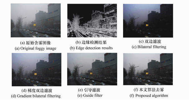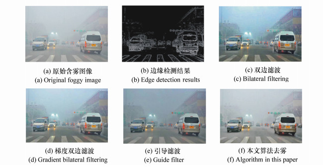 Aiming at the halo effect and the color distortion of bright areas when using traditional dark priori image defogging algorithms, we propose a traffic image dehaze method based on adaptive transmittance estimation with multi-scale window in this paper. Firstly, a new 8-direction edge detection operator is used to detect abrupt changes in field depth in images. According to the dark channel prior theory and the abrupt change of field depth obtained in the previous step, a 5×5 window is used in the larger area of field depth transformation and a 15×15 window is used in the smaller area to obtain a dark primary color estimation image. At the same time, targetting the problem of inaccurate estimation of transmittance when there is a white area in the close-range region due to the dark channel priori principle, we introduce an adaptive transmittance restoration method. An edge-enhanced dark image is obtained by using a guide filter, and the texture difference between the edge-enhanced dark image and the original dark primary image is used to correct the transmittance in the close-range region, and then to complete image dehazing. The experimental results show that the halo phenomenon exists in both the bilateral filter and the gradient bilateral filter, and the color distortion is serious in the bright area containing white objects, causing the objective evaluation index to be meaningless. Compared with the guide filter, the indexes of the dehazing algorithm used in this paper show improvement, wherein the average gradient increased by 8.305%, the PSNR increased by 12.455% and the edge strength factor increased by 7.77%. The algorithm can effectively solve issues arising from the halo effect and color distortion in bright areas in restored images while providing a more effective dehazing effect.