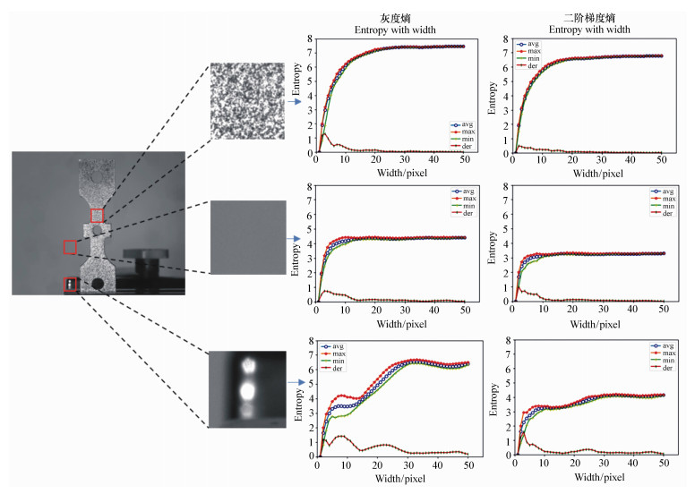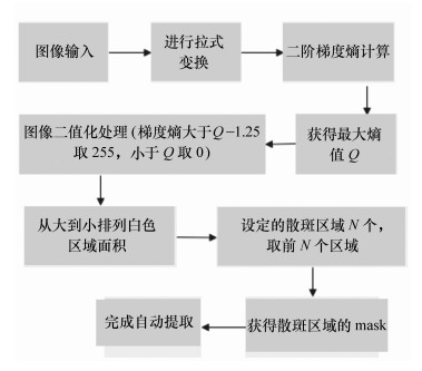 In digital image correlation measurements, the speckle area is manually selected before the correlation calculation is performed to define the matching area. With the development of industrial automation, facing the complex shape of the speckle area and the need to measure a large number of speckle images, it is crucial to find an automatic area extraction method. According to the characteristics of speckles and by comparing various conventional edge detection methods, a decision function based on second-order gradient entropy is proposed for automatically detecting speckle regions in images. By analyzing different speckle images, the optimal sub-region entropy size interval and the adaptive threshold interval in different speckle patterns were determined and the automatic extraction of the speckle region were completed by using connected region segmentation. The method was verified by using the actual speckle pattern. The experimental results show that when the entropy size of the subregion is more than 10 pixel, the decision function is sensitive to the speckle area. When the adaptive threshold value is within the range of Q-1.25 to Q, the speckle area and the background area can be effectively separated. The automatic extraction of a speckle area can be completed and the selection of speckle area before correlation calculation is achieved.