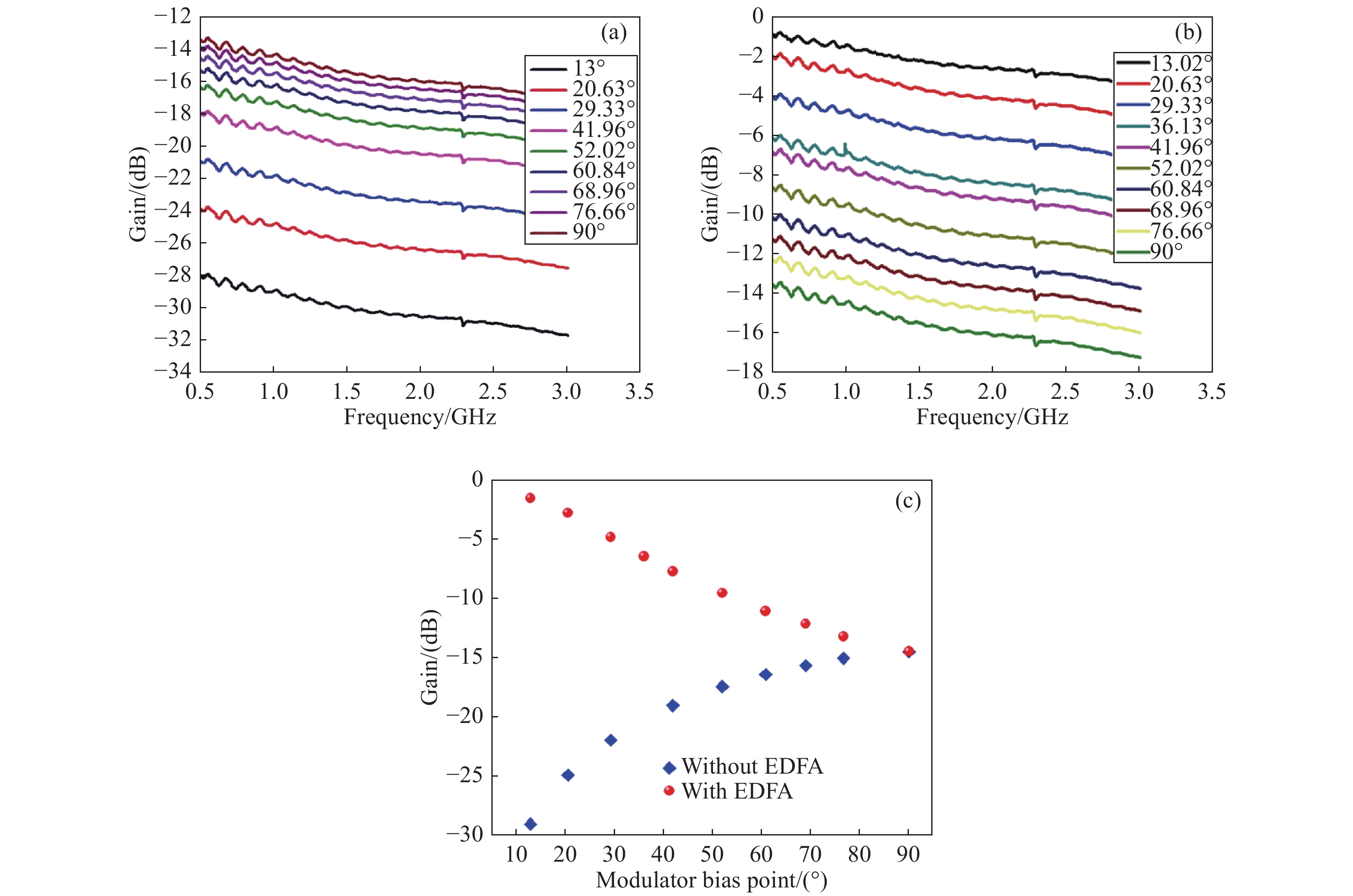 Photonics have long been viewed as an enabling technology that extends the sensing and signal processing performances of Radio Frequency (RF) remoting systems such as radar and electronic-warfare because of its inherent advantages in multi-octave operating frequencies, broad instantaneous bandwidth, low transmission loss, and good phase linearity. In order to improve the efficiency of the analog optical transmitter during electronic-to-optical conversion, an Erbium-Doped Fiber Amplifier (EDFA) combing with a low-bias modulator in an external intensity modulation direct detection link is applied. According to our analysis, the RF gain reduces linearly with modulator’s optical power output when the bias becomes close to its minimum. Thus, the gain provided by the EDFA to the optical signal was transferred to increase RF transmission efficiency. Experimental results indicated that the RF gain improved by 13.5 dB compared to that of conventional quadrature bias point transmissions. Meanwhile, a small penalty is introduced to system noise. Most importantly, this can be achieved by using off-the-shelf devices, which can drastically reduce the system’s cost. Finally, the proposed scheme can be widely used in electronic information equipment.