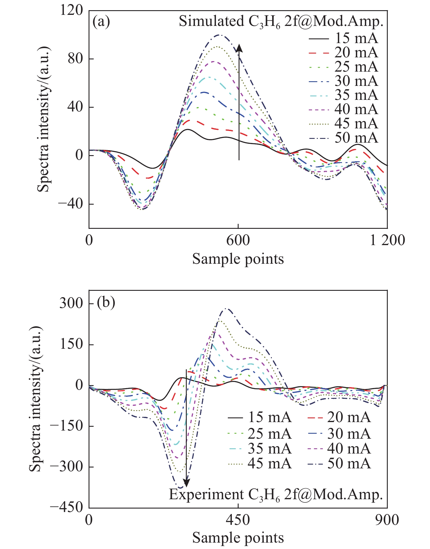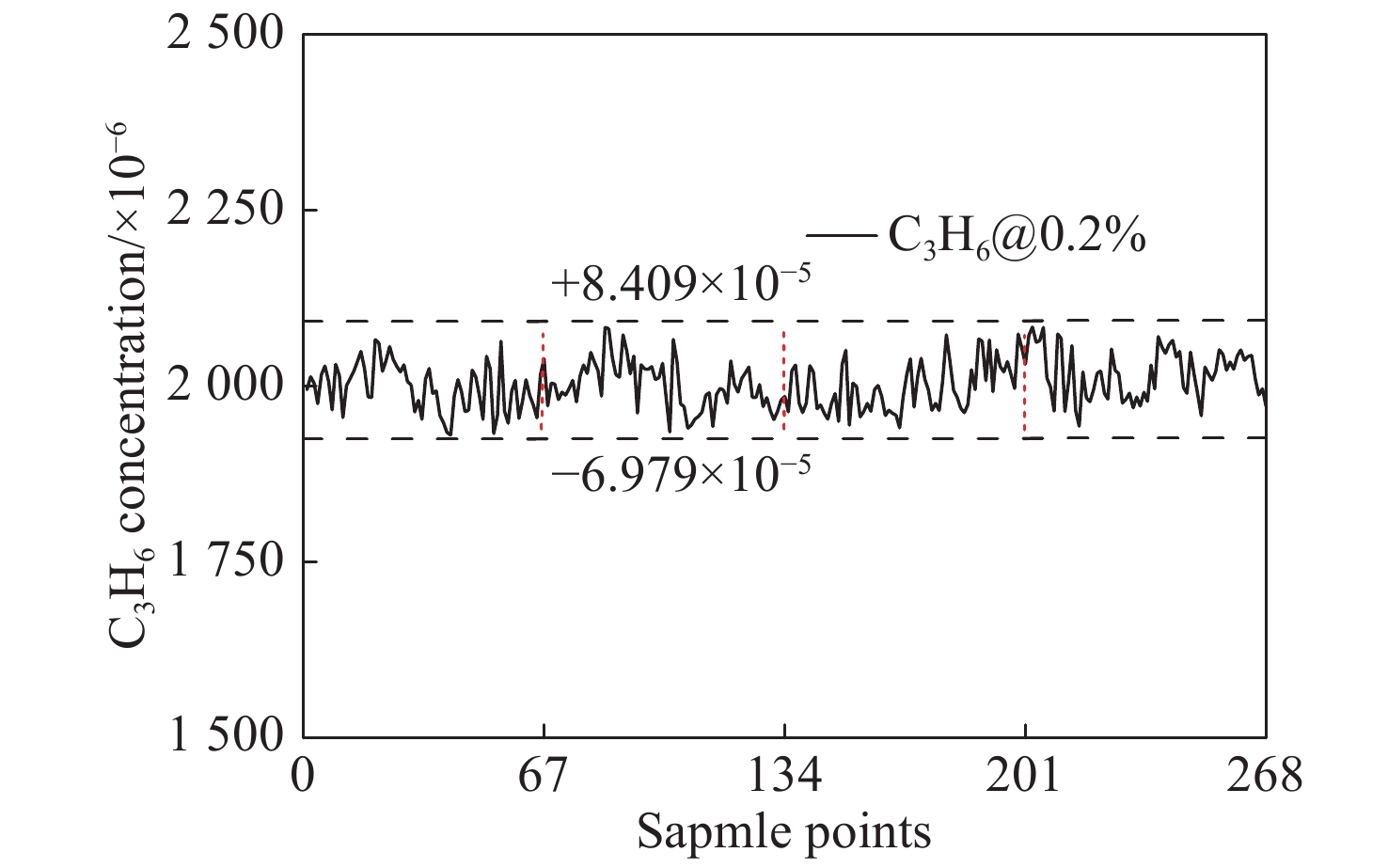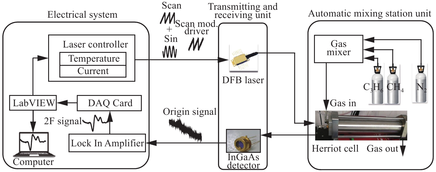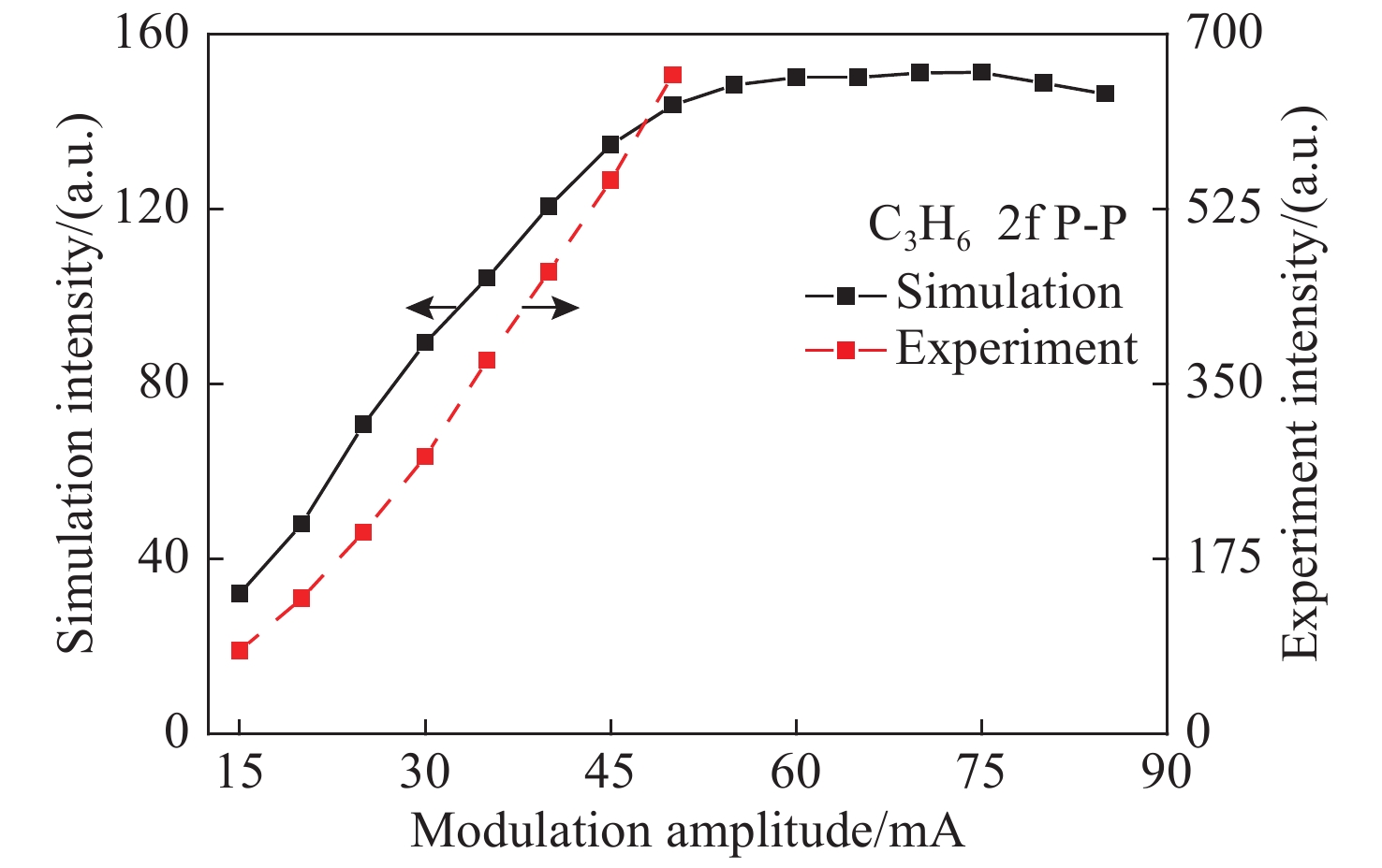 To satisfy the need for propylene measurement in the olefin production process, Tunable Diode Laser Absorption Spectroscopy (TDLAS) was studied to improve analytical performance. In this paper, a numerical simulation approach is proposed using absorbance from a spectral database to obtain the optimized design parameters, which is independent of spectral features. In the simulation, the effect of a wider linewidth laser on the absorbance profile was considered. Through the comparison of simulation results and experimental collection, the TDLAS-based propylene analysis apparatus was developed correspondingly. It has a 1 628.5 nm center wavelength broad-tuning DFB laser. A differential method was utilized in demodulated spectral acquisition to eliminate bias voltage. The multivariate linear regression model was employed to reduce the strong spectral interference from the background components in the analysis. Based on the simulated field test, the max relative error is 0.55% in the 0~1% range for the step test. For the long-term test, the standard deviation (1σ) is 9.3×10−6 for 0.2% propylene concentration. The best standard deviation is 1.33×10−6 at 221.9 s of integration time through Allen variance analysis. In the anti-interference test, the max error of 19.17×10−6 is demonstrated for 0.2% propylene concentration while methane and ethylene concentrations vary. The disadvantages of traditional methods such as the Gas Chromatogram (GC) and soft measurement methods are overcome by modulated absorption spectroscopy. The TDLAS system for heavy hydrocarbon detection with complex spectral features was demonstrated to have distinct advantages in precision, stability and interference suppression through multivariate regression modeling.