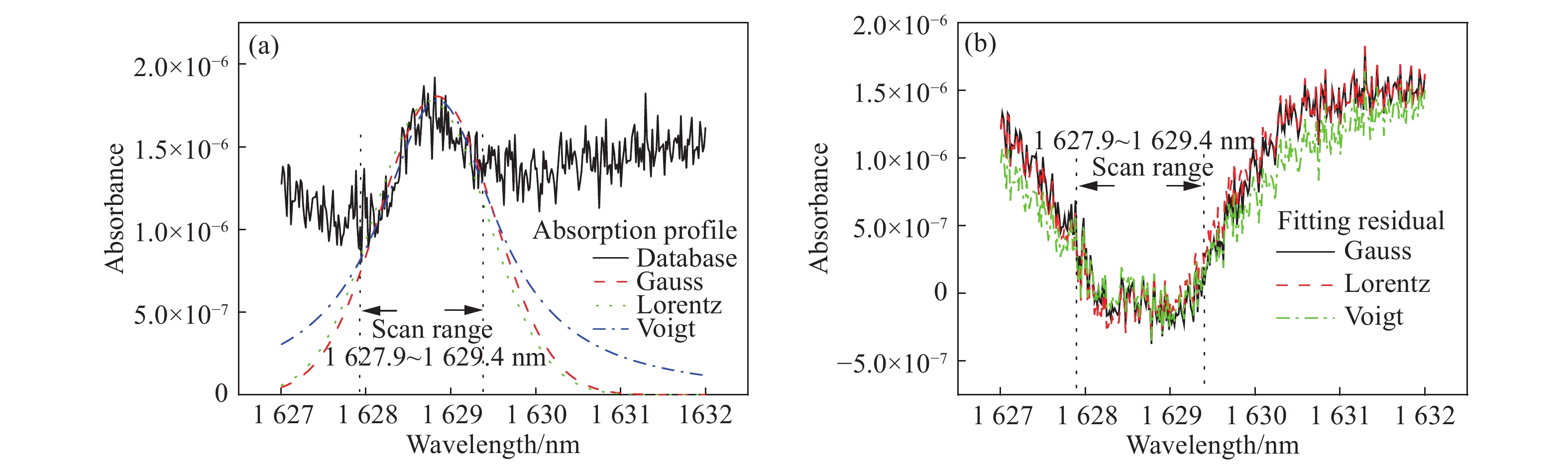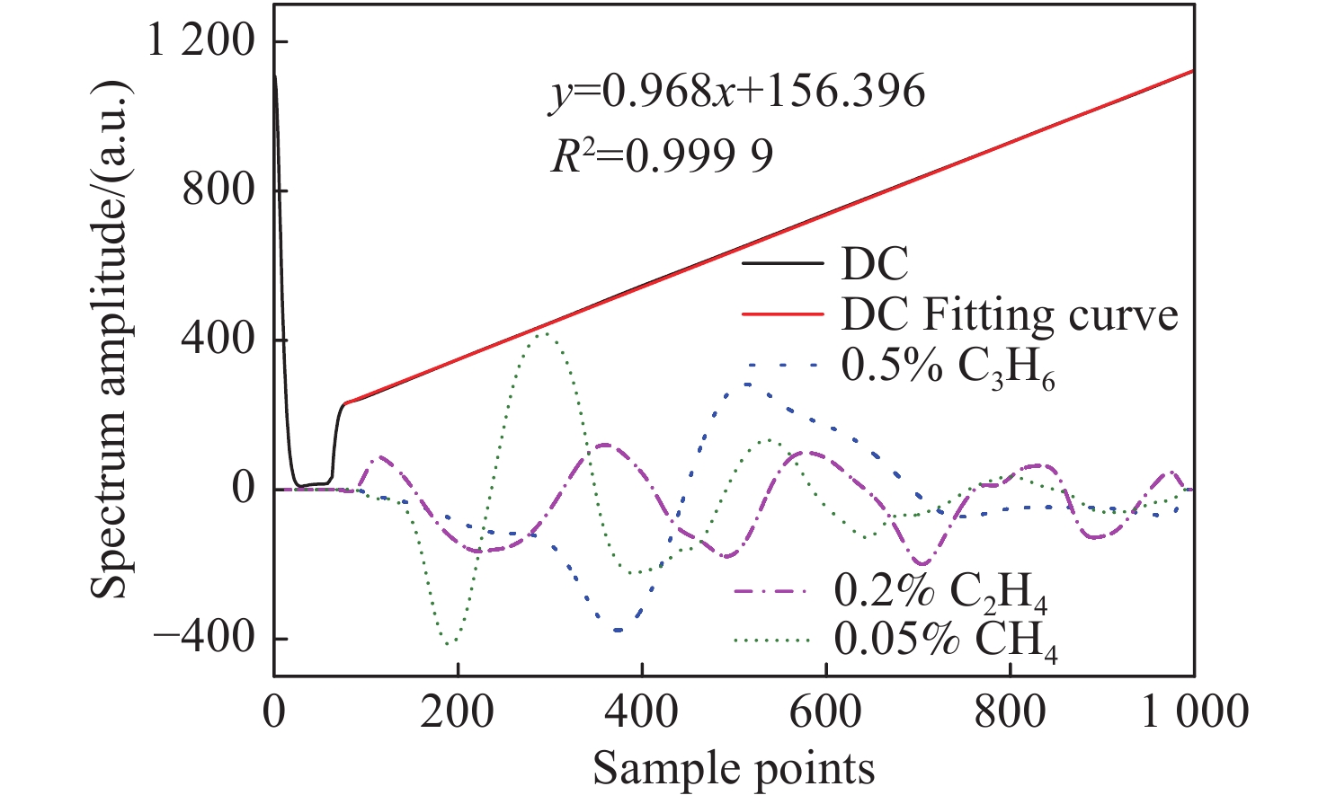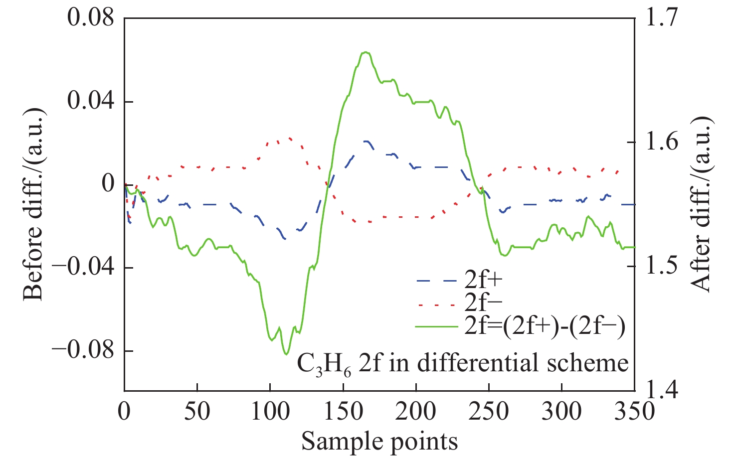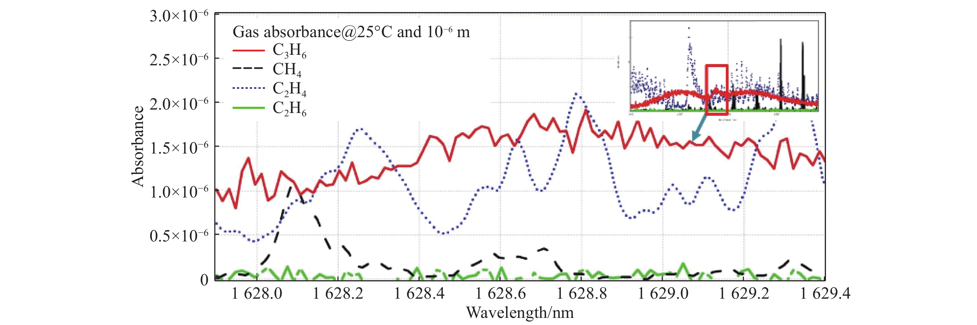 To satisfy the need for propylene measurement in the olefin production process, Tunable Diode Laser Absorption Spectroscopy (TDLAS) was studied to improve analytical performance. In this paper, a numerical simulation approach is proposed using absorbance from a spectral database to obtain the optimized design parameters, which is independent of spectral features. In the simulation, the effect of a wider linewidth laser on the absorbance profile was considered. Through the comparison of simulation results and experimental collection, the TDLAS-based propylene analysis apparatus was developed correspondingly. It has a 1 628.5 nm center wavelength broad-tuning DFB laser. A differential method was utilized in demodulated spectral acquisition to eliminate bias voltage. The multivariate linear regression model was employed to reduce the strong spectral interference from the background components in the analysis. Based on the simulated field test, the max relative error is 0.55% in the 0~1% range for the step test. For the long-term test, the standard deviation (1σ) is 9.3×10−6 for 0.2% propylene concentration. The best standard deviation is 1.33×10−6 at 221.9 s of integration time through Allen variance analysis. In the anti-interference test, the max error of 19.17×10−6 is demonstrated for 0.2% propylene concentration while methane and ethylene concentrations vary. The disadvantages of traditional methods such as the Gas Chromatogram (GC) and soft measurement methods are overcome by modulated absorption spectroscopy. The TDLAS system for heavy hydrocarbon detection with complex spectral features was demonstrated to have distinct advantages in precision, stability and interference suppression through multivariate regression modeling.
