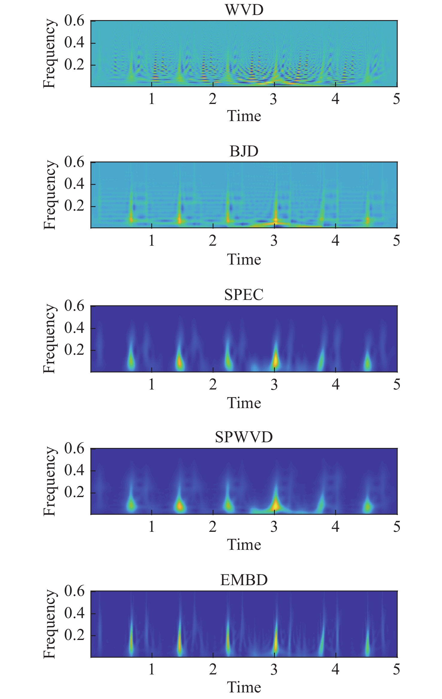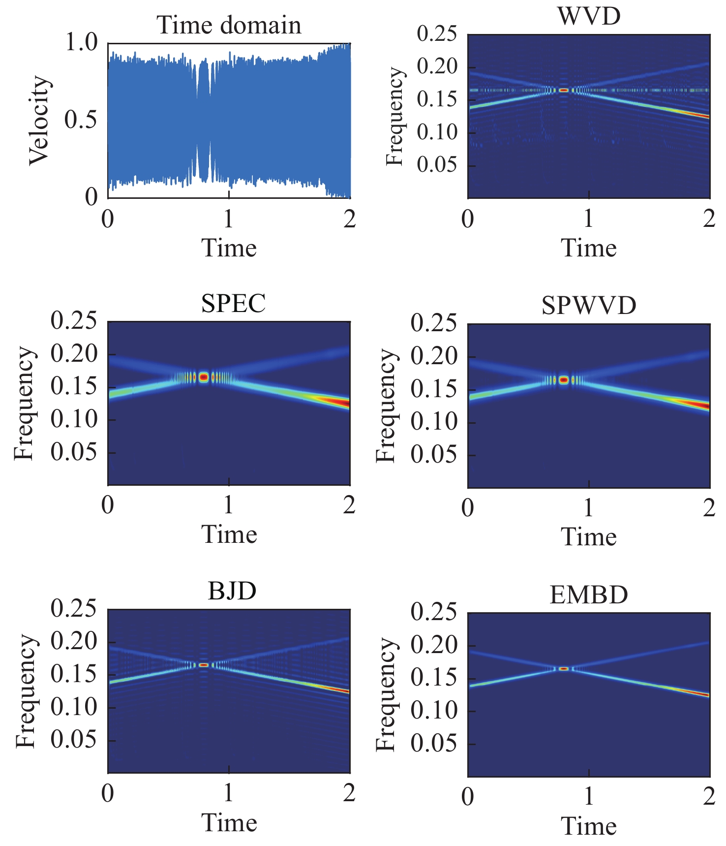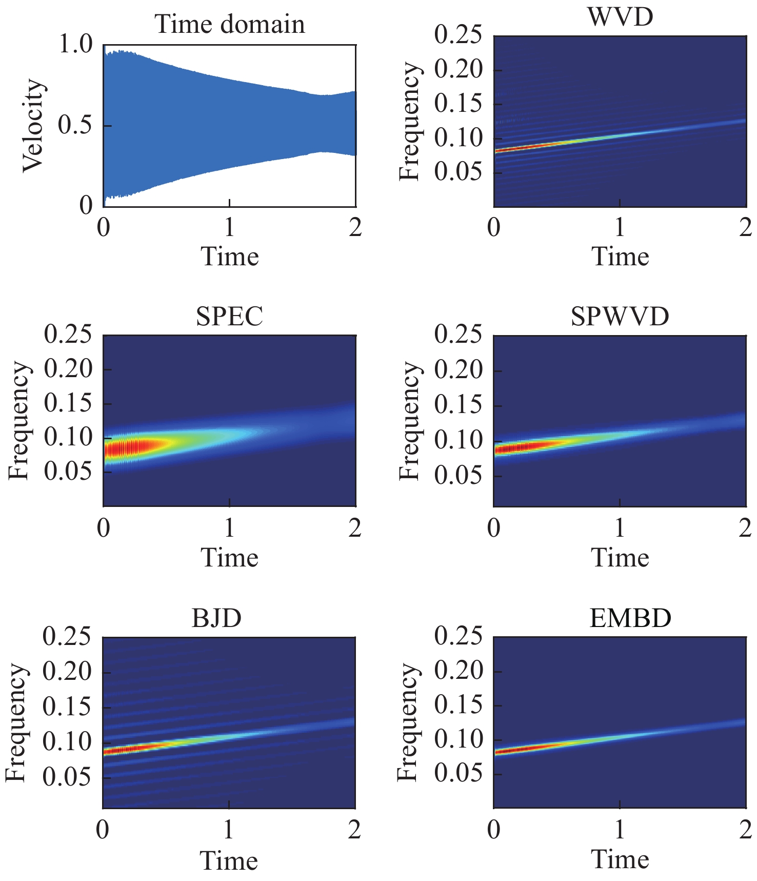 Most actual vibration signals measured by lidar are time-varying signals. Methods of time-frequency analysis based on Fourier transforms are effective tools for processing time-varying signals. In this paper, the properties of the Wigner-Wiley distribution, the smooth pseudo-Wigner-Wiley distribution, the spectrogram, the Bonn-Jordan distribution, and the extended modified B distribution are compared and analyzed with actual vibration signals measured by laser Doppler radar. Three kinds of vibrations are measured with a laser Doppler radar: chirps generated by a single loudspeaker, two-component chirps generated by two loudspeakers, and adult male heartbeat vibrations. Their time-frequency distribution resolution and the suppression of cross-terms are analyzed. By calculating the time-frequency concentration index, the analysis capacites of the five distributions for three vibrations are compared. Experimental results indicate that the performance of the extended modified B distribution is better than that of the other four time-frequency distributions. Therefore, the extended modified B distribution is more suitable for the detection of material resonance frequency of laser Doppler radar and the detection of heartbeat.