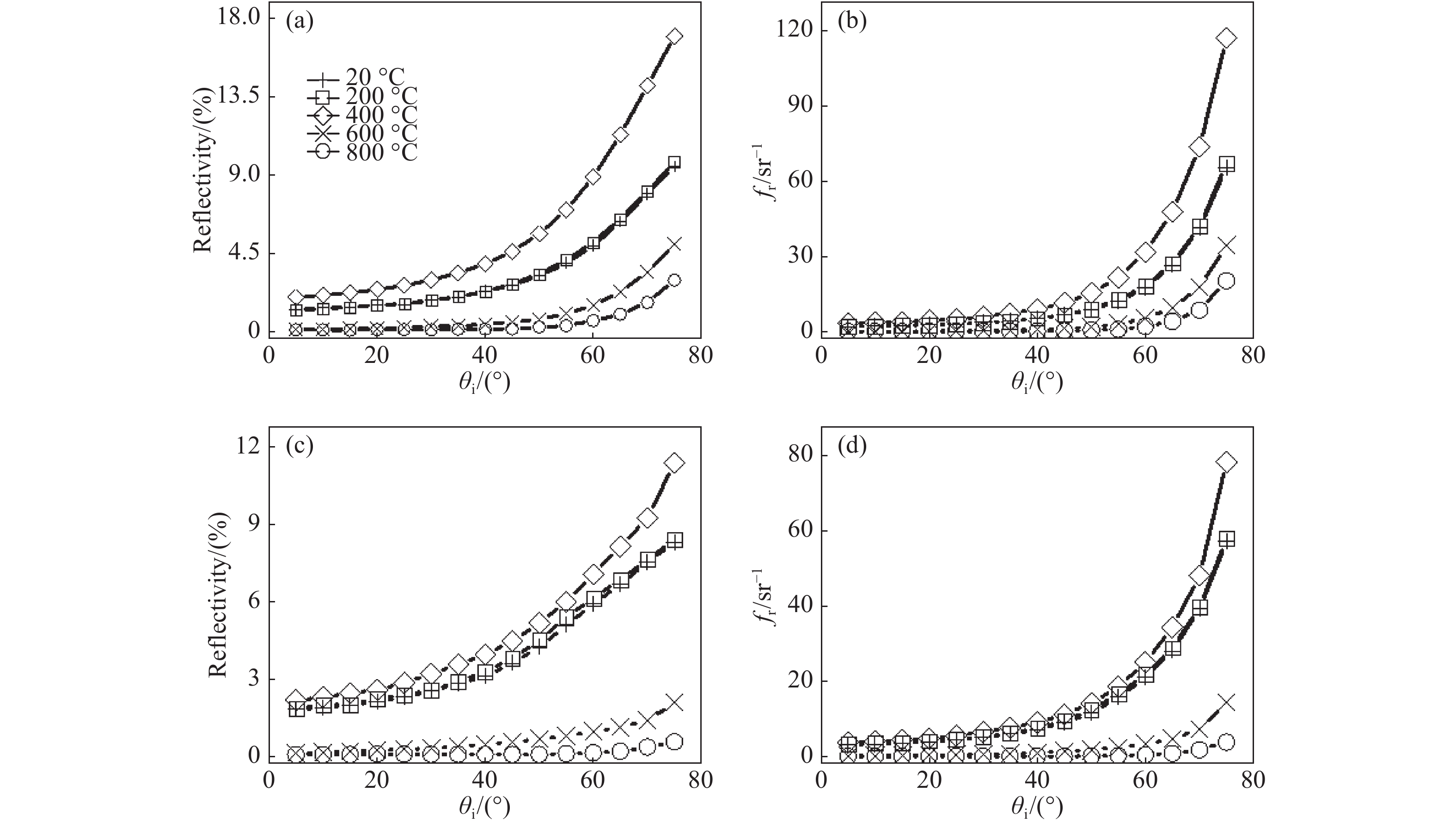 The spectral polarized BRDF of a brass surface in the near-infrared region was measured using the absolute measurement method with a home-made device. The temperature range was 20~800 ℃, and the influence of temperature on the BRDF was analyzed. The results indicate that temperature has an obvious influence on the BRDF of brass. With an increase in temperature, the BRDF was almost constant at first, then increased before finally decreasing. Scanning electron microscope testing, roughness measurement and X-ray diffraction analysis of the brass surface at different temperatures were performed. The test results indicate that the influence of temperature on BRDF can be attributed to variation in surface morphology and chemical composition.
