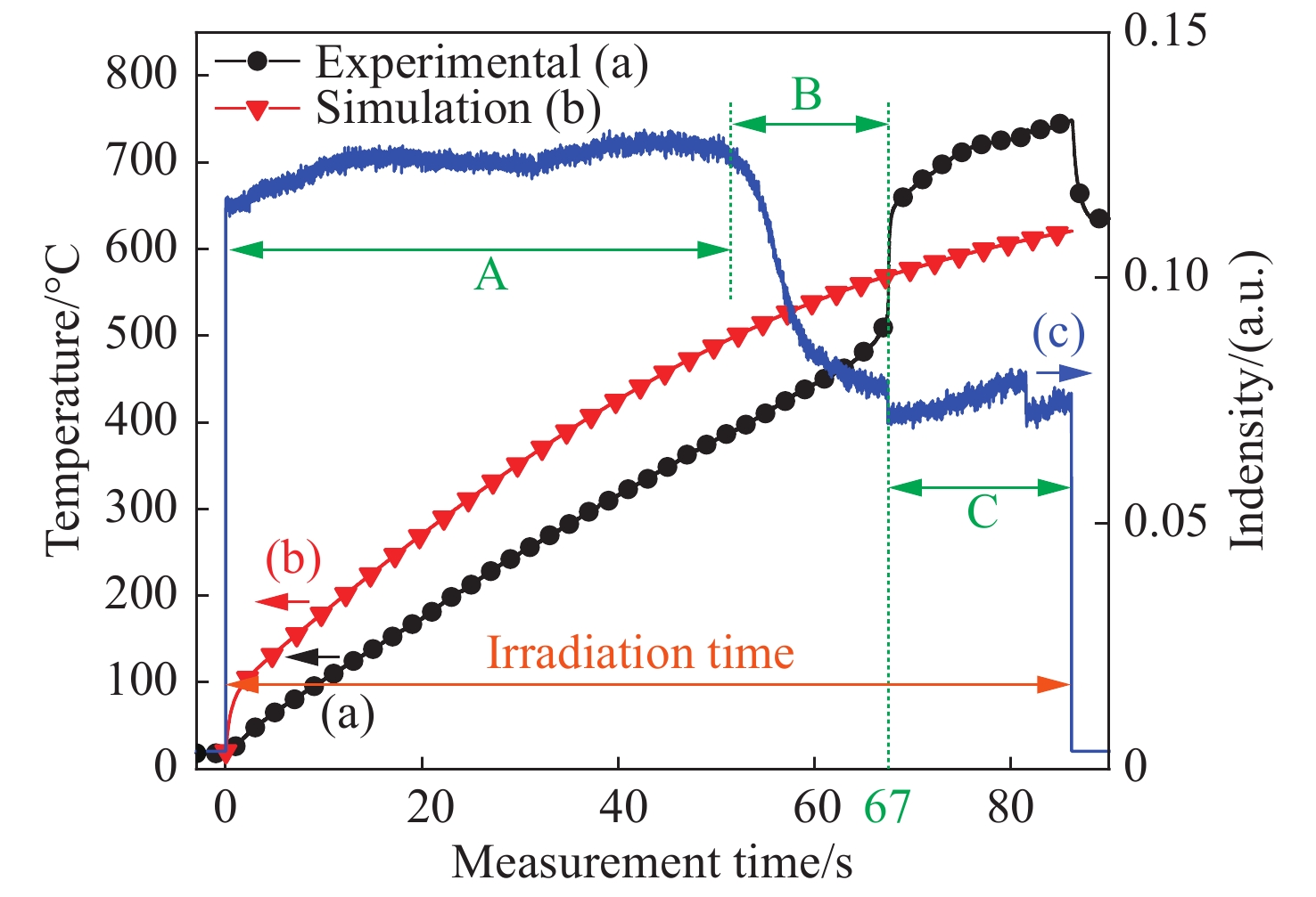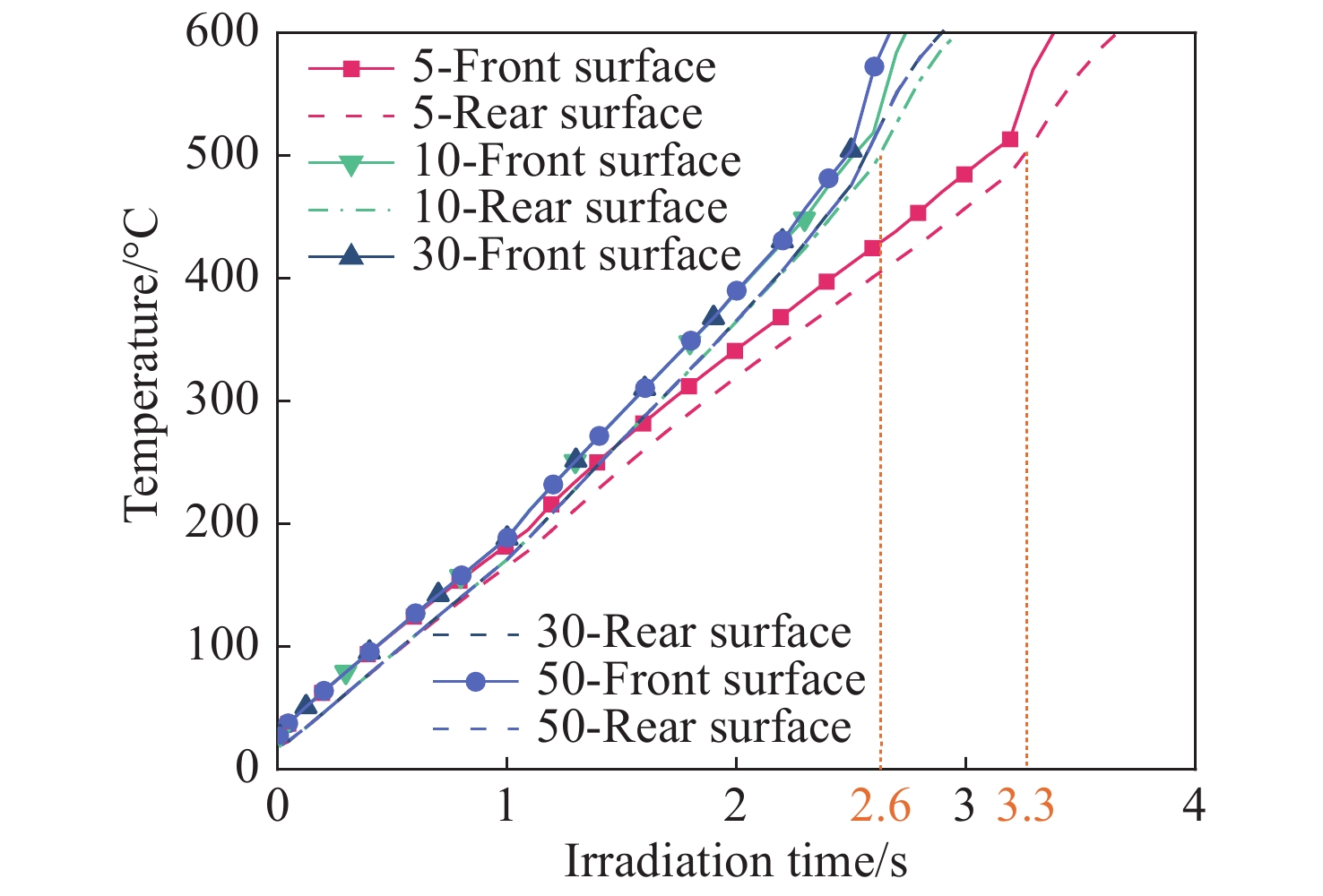In order to investigate the temperature response and thermal damage of a 6061 aluminum alloy after variations in spot size of continuous laser irradiation, a three-dimensional physical model under laser irradiation was established based on ANSYS finite element software. First, we used different laser parameters to carry out laser irradiation experiments, and then, based on the collected temperature and front surface scattered light intensity data, we calculated the dynamic changes in the absorptivity of the target during laser irradiation. Finally, the optimized model was used to analyze the temperature rise characteristics of the target irradiated by lasers at different spot sizes. The research results show that the absorption rate of the material increases with an increase in temperature under 1000 W/cm2 laser irradiation. Due to the localized characteristics of laser loading, lateral thermal diffusion affects the longitudinal temperature rise, and its effect becomes smaller when the spot is larger, as related with the alloy’s thermal diffusion length. For the 6061 aluminum alloy material with a thickness of 4 mm, when the spot size is greater than 10 cm, the effect of the spot’s size is negligible, and the time threshold of fusion damage on the back surface of the target remains unchanged at 2.6 s.