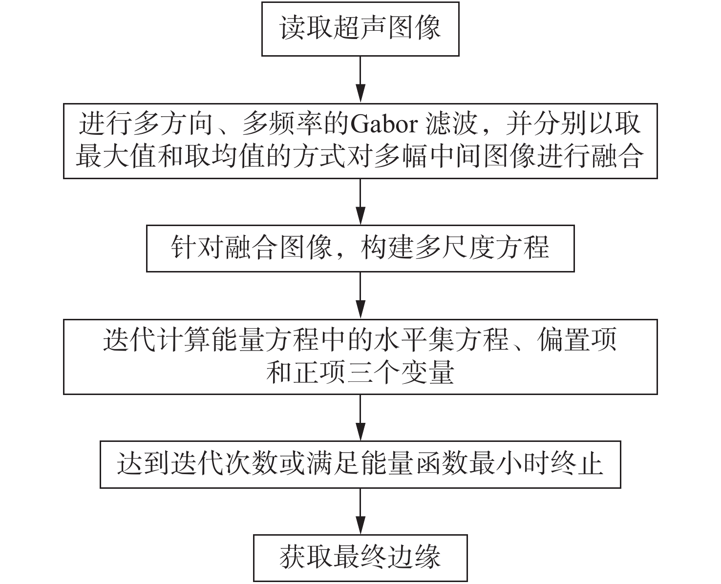 To address the weakness and discontinuity of the edges and the uneven distribution of gray in ultrasonic images, an improved edge extraction algorithm based on a multi-parameter Gabor filter and multiscale local level set method is proposed. With the grayscale inhomogeneity of ultrasound images being regarded as texture in different directions, the directionalities of the Gabor wavelet are adopted to filter at different angles. An intermediate image is obtained to isolate the difference between each region and the background, which will allow the retention of the original image by maximizing it with a fusion method. The Gabor filter kernel with multi-center frequency meets the complex frequency distribution characteristics of ultrasound images, and the mean fusion method is used to maximize the information in the image while reducing noise influence. For the edge of the ultrasound image is weak and the grayscale is uneven, the local intensity clustering level set method is improved. A Gaussian convolution kernel template is applied with different variance sizes to fit the grayscale changes in different parts of the image. Testing the ultrasound images of a stomach show that correlation coefficient and sensitivity coefficient reaches 0.856 and 0.910, respectively, which is a 20.7% and 5% improvement over the traditional LIC algorithm, respectively. This method can satisfy the system requirements where non-contact, online, real-time, higher precision and rapid speed strong anti-jamming and stabilization are needed.