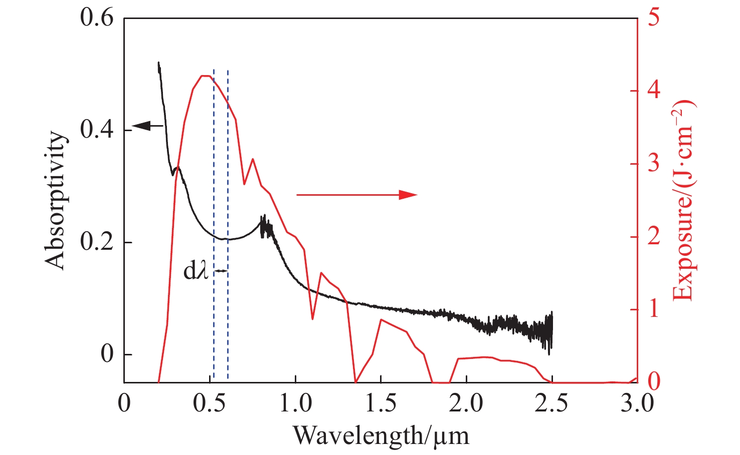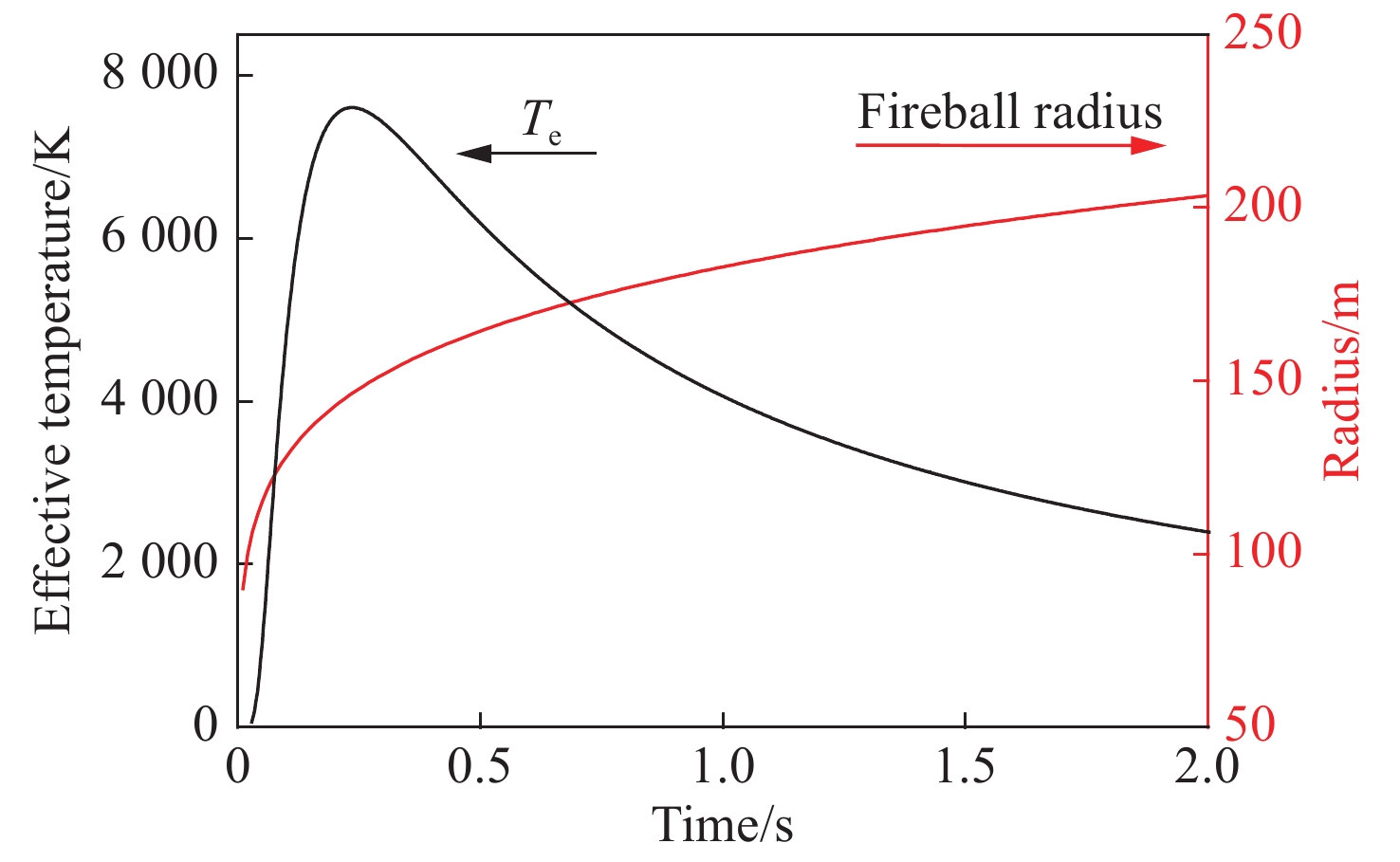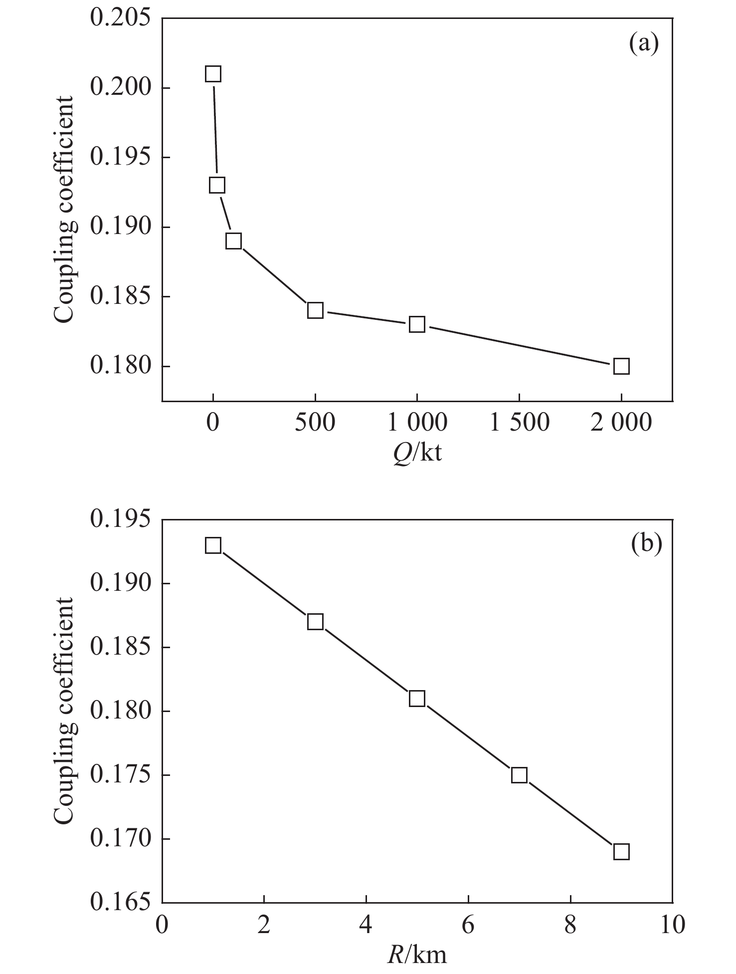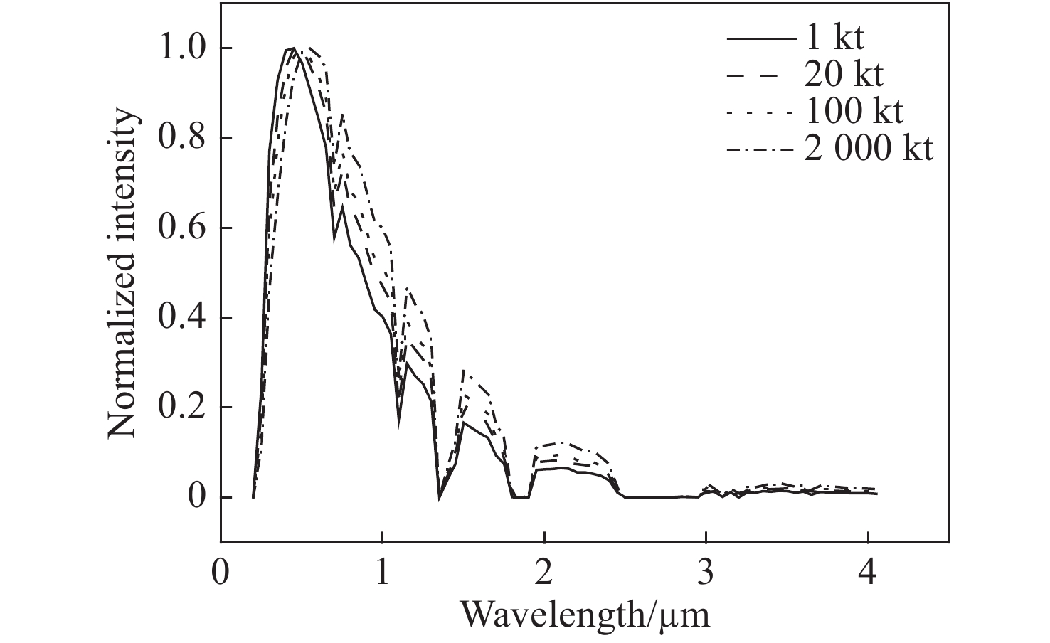 To obtain the energy coupling characteristic of materials under strong explosive thermal radiation, a physical model for calculating radiation source parameters and atmospheric transmission is constructed, and the characteristics of the radiation spectrum at the target location under different conditions are obtained. The energy coupling coefficients of several kinds of materials are produced by spectral reflectance measurement and by calculating the average absorption coefficient of thermal radiation. The coupling coefficients of metal and ceramic materials are relatively small while it can be as high as 0.92 for carbon fiber epoxy composites. The coupling coefficient calculated from the actual thermal radiation spectrum is higher than that calculated from 6000 K blackbody radiation spectrum, and the maximum difference is about 14%. Taking aluminum material as an example, the coupling coefficient of thermal radiation decreases gradually with the increase of explosion yield and distance, but the overall variation is small.