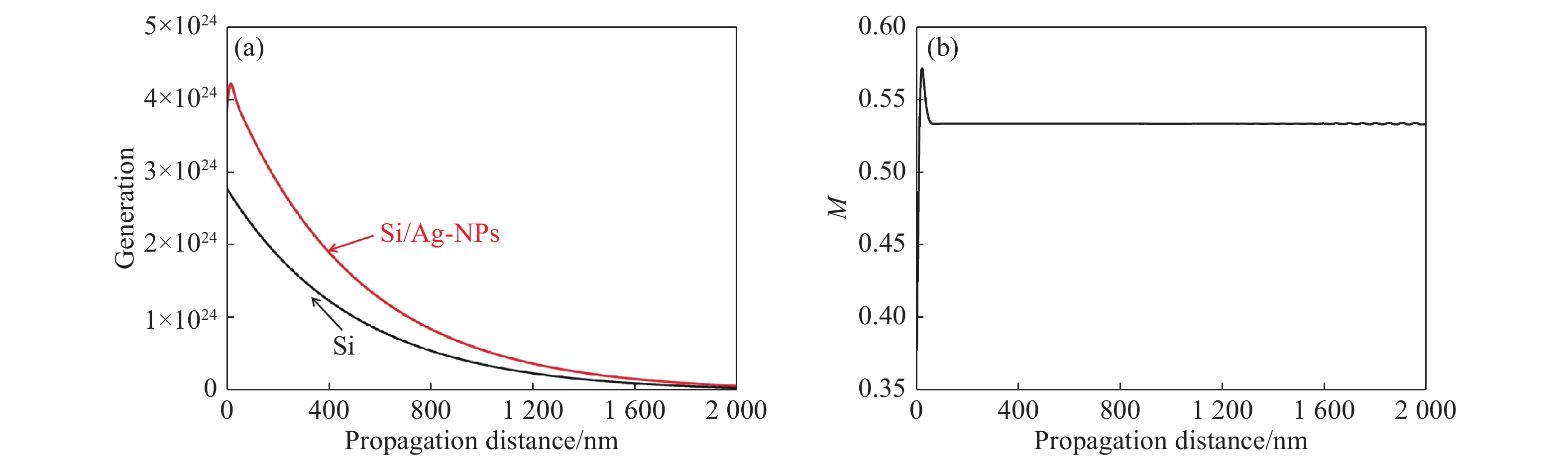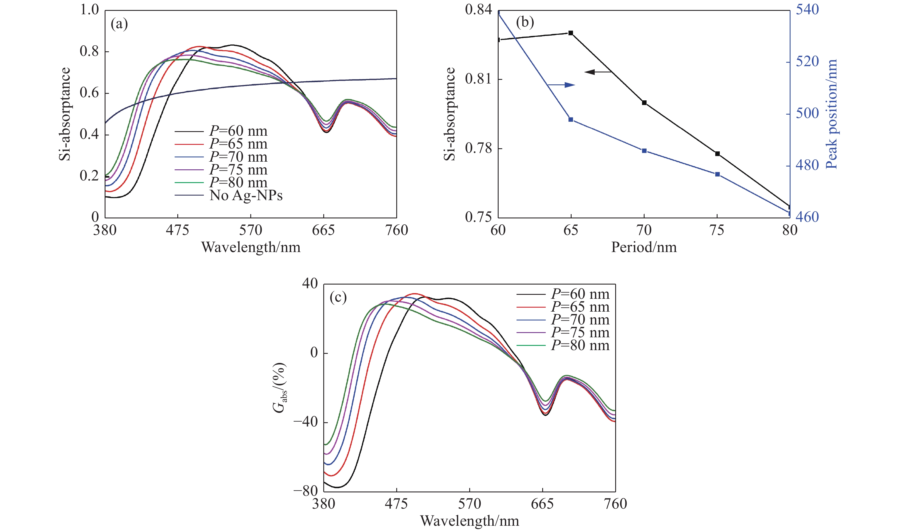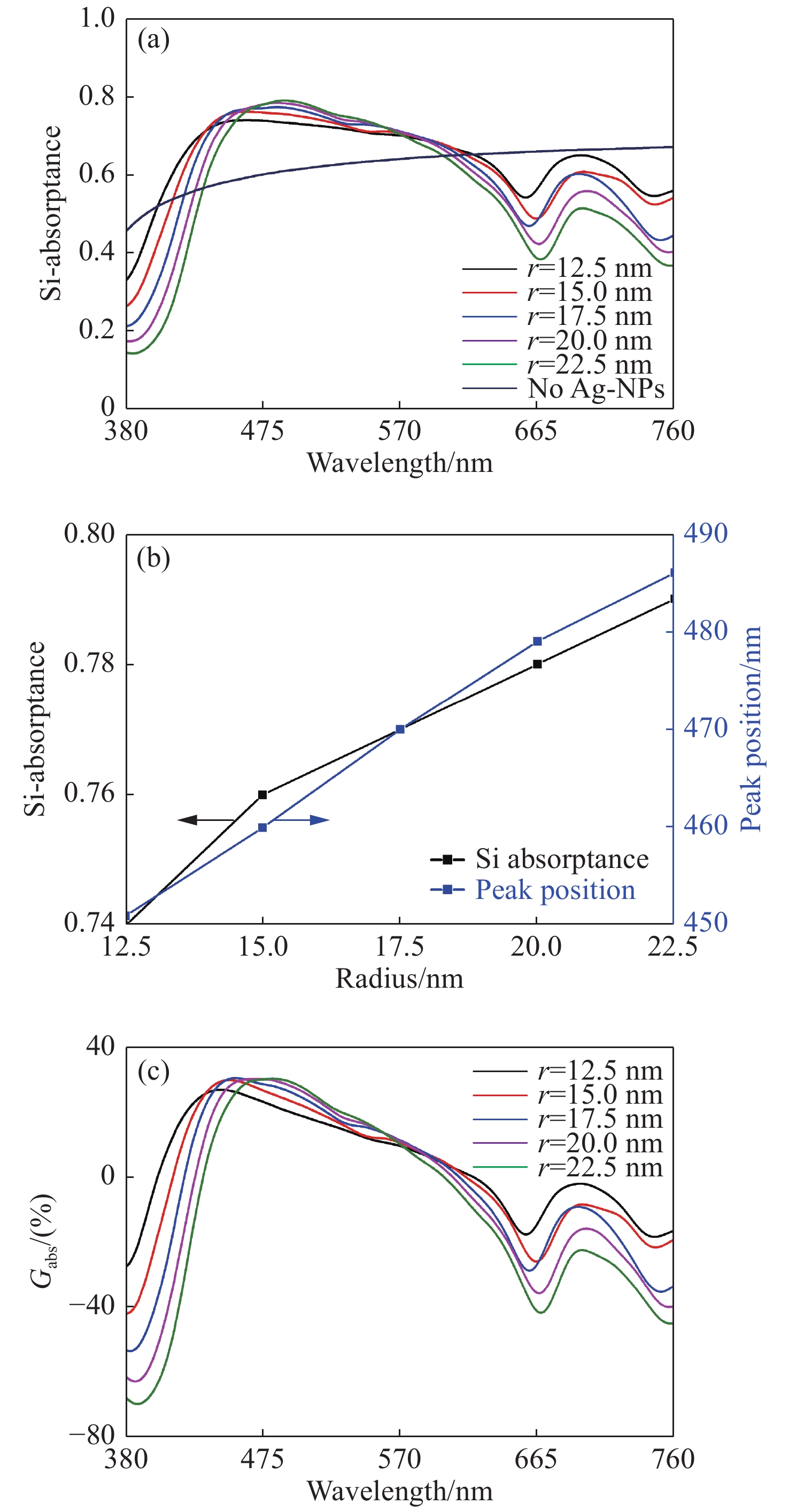 To enhance the blue light absorption of silicon, an array of silver nanoparticles(Ag-NPs) was designed so that they create Localized Surface Plasmon Resonance(LSPR) near the surface of silicon(Si). The properties of the enhanced optical absorption of silicon in the blue band were then observed and researched. The blue-light absorption characteristic of silicon in the Ag-NPs/Silicon composite structure were calculated using the Finite-Difference-Time-Domain (FDTD) method. The results indicated that the metallic nanoparticles' extinction capability was related to its geometric parameters and the resonance intensity and peak wavelength can be tuned according to different geometric parameters of Ag-NPs including radius, height and period. At a resonance peak wavelength of 465 nm, the optical absorption of Si in the composite structure (Ag-NPs/Si) rises from 59% to 94% with an array of radius r = 18.5 nm, a height H = 45.0 nm and a period P = 49.0 nm. It concluded that the light absorption gain was 0.57 and photogenerated carriers had a gain factor of 0.53 due to the enhanced light absorption of Si via LSPR in blue band. The results provide a significant reference for the enhancement of the blue-light absorption properties in silicon based on the LSPR effect and the design of a silicon-photodetector with a visible wide spectral resoponse.