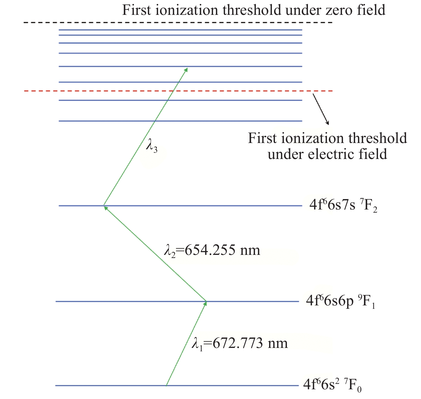 In order to obtain the first ionization threshold of Sm atom, the photoionization signal, autoionization signal and field ionization signal generated by the Sm atom under multi-step excitation were distinguished, and the influence of the Rydberg state of the Sm atom with different magnetic quantum numbers on the first ionization threshold was studied. At first, by use of multi-step resonance excitation combined with polarization technology, the rare-earth Sm atoms were excited to the autoionization or bound Rydberg state with a specific magnetic quantum number near the first ionization threshold. Then the ions generated by photoionization and autoionization were pushed out of the action zone by the reverse electrostatic field, and a delayed pulsed electric field was applied to detect the Sm atoms of bound Rydberg state. Finally, the relationship between the first ionization threshold of Sm atom and the varying intensity of electrostatic field was acquired, and the first ionization threshold of the Sm atom with different magnetic quantum numbers under zero field was determined by fitting. The experimental results show that the first ionization threshold of Sm atom is 45519.69±0.17 cm−1, which has been compared with the results obtained by other methods. The effectiveness of the delayed field ionization technique in measuring the first ionization threshold of Sm atom has been verified.