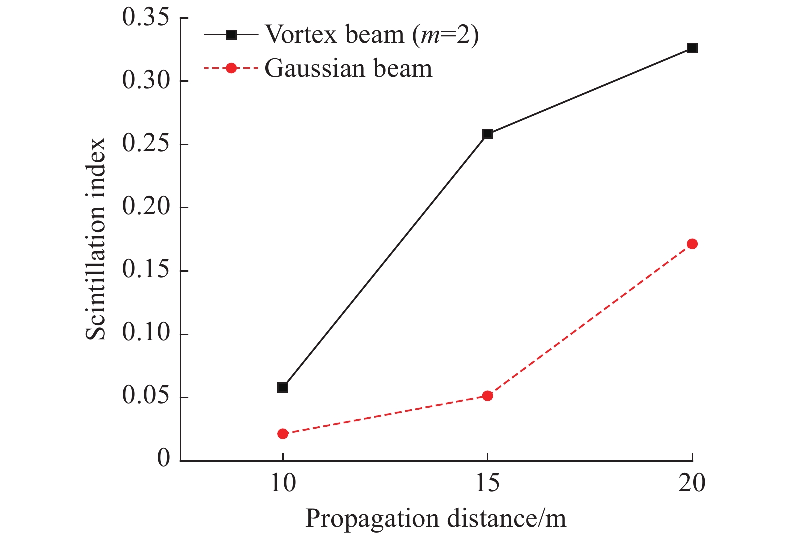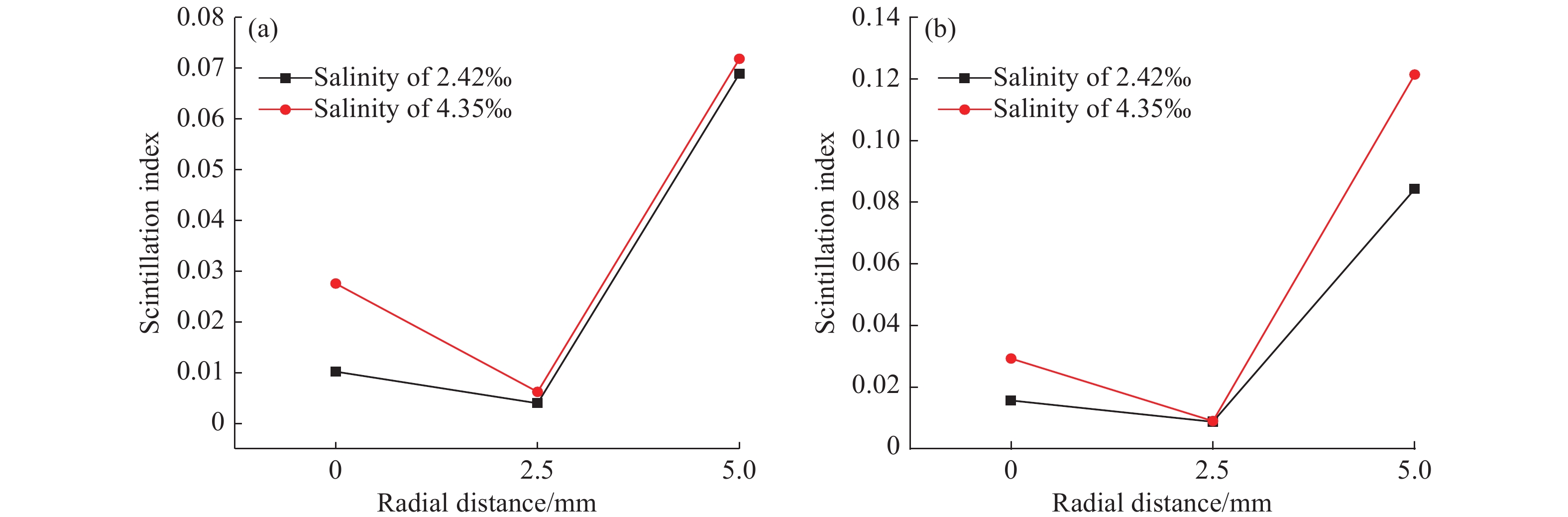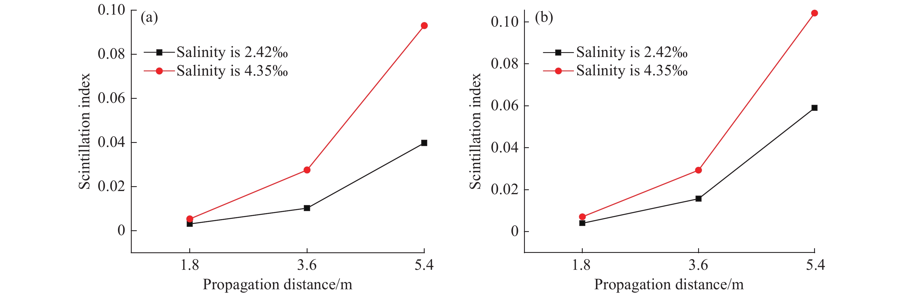 It is very important to study the propagation characteristics of light beams in ocean turbulence. In order to get closer to the actual situation, we build a device which can control both the salinity and the intensity of underwater turbulence to study the propagation characteristics of vortex beams and a Gaussian beam in underwater turbulence. The results show that compared with the underwater turbulence without sea salt, the light spot will be more diffuse and the light intensity will be weaker in the underwater turbulence with sea salt. When the topological charge m is 2, the scintillation index of the vortex beam in the underwater turbulence with salinity of 4.35‰ is larger than that in the underwater turbulence with salinity of 2.42‰, no matter it is strong turbulence or weak turbulence. When the vortex beam with m=2 propagates to the same distance, the scintillation index increases with the increment of the salinity and the intensity of underwater turbulence. Under different salinity conditions, the radial scintillation index of the vortex beam with m=2 decreases firstly and then increases with the increase of the radial distance. In addition, we set up another experimental device which can transmit a longer distance. The scintillation index of the vortex beam with m=2 is much higher than that of the Gaussian beam in the underwater turbulence within 20 m propagation distance, and the scintillation indices of both the vortex beam with m=2 and the Gaussian beam increase with the increase of the propagation distance.