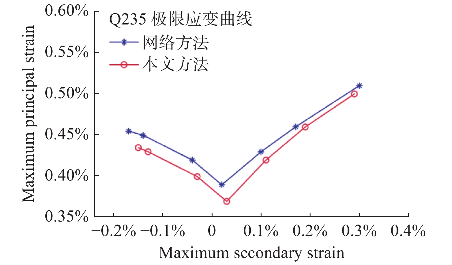 To address the difficulty in measuring the strain limit of pliable composite film forming tests, a measurement method based on binocular stereo vision combined with digital image correlation is proposed. Firstly, to address the image matching problem in large deformations or cracks in thin films, a weak-correlation step-by-step matching method based on adaptive updating of image matching benchmarks is proposed according to the continuity of adjacent state deformation of series images. Then, according to the differences in the surface strain distribution of the film material with that of the steel parts, a strain field is proposed to fit the limit strain curve of the film material. The software and hardware system of visual measurement is built, and the limit strain curve of a Q235 steel specimen is measured and compared to results from the coordinate grid method. The limit strain accuracy can be improved by 0.02%, which proves the feasibility and accuracy of this method. The pliable composite film specimens prepared by PET, Nylon, Al foil, PP were each measured. The method and system successfully completed the measurement of the forming limit curve of the pliable composite film. The comparative experiments show that the proposed method can quickly and accurately measure the surface strain distribution of pliable composite film during forming. Compared with the coordinate grid method, it has obvious advantages and provides a highly reliable and highly precise method for solving the forming limit strain curve of film materials.