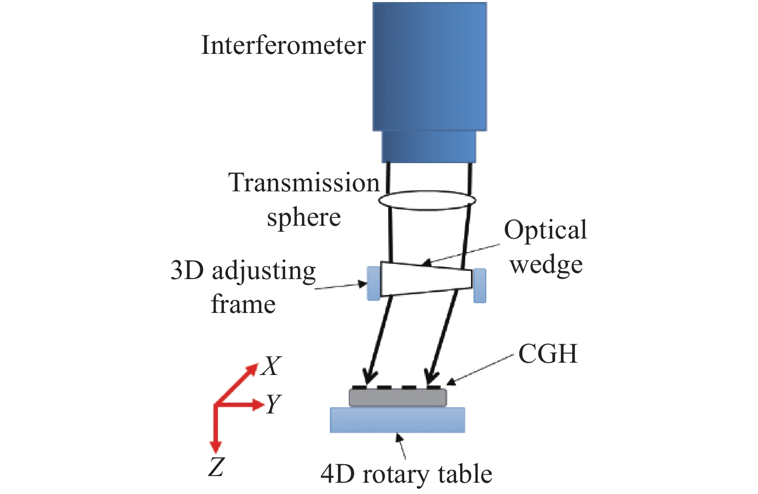Accurate measurement of three-dimensional attitude angle is widely used in aviation, aerospace, national defense and other fields. In order to realize convenient and accurate measurement of three-dimensional attitude angle, an optical system based on a lens array is designed and an analysis model of micro-three-dimensional attitude angle measurement is established in this paper. In the system, the collimated parallel beam passes through four array lenses arranged in a pyramid shape to form regular array spots on a CCD. By analyzing the distance between the spots on the CCD image, the distance between the adjacent aperture on the lens array and the inclination angle between the lens array and CCD, the beam pitch angle and azimuth angle relative to the receiving system can be obtained. By using the angle of the lines of the array spots relative to the horizontal or vertical plane, the roll angle about the Z axis can also be obtained. Compared with the measurement results of the high-precision autocollimator, the measurement accuracy of the proposed method is verified to be RMS≤0.1″. The results show that the proposed method can realize the measurement of three-dimensional attitude angle.