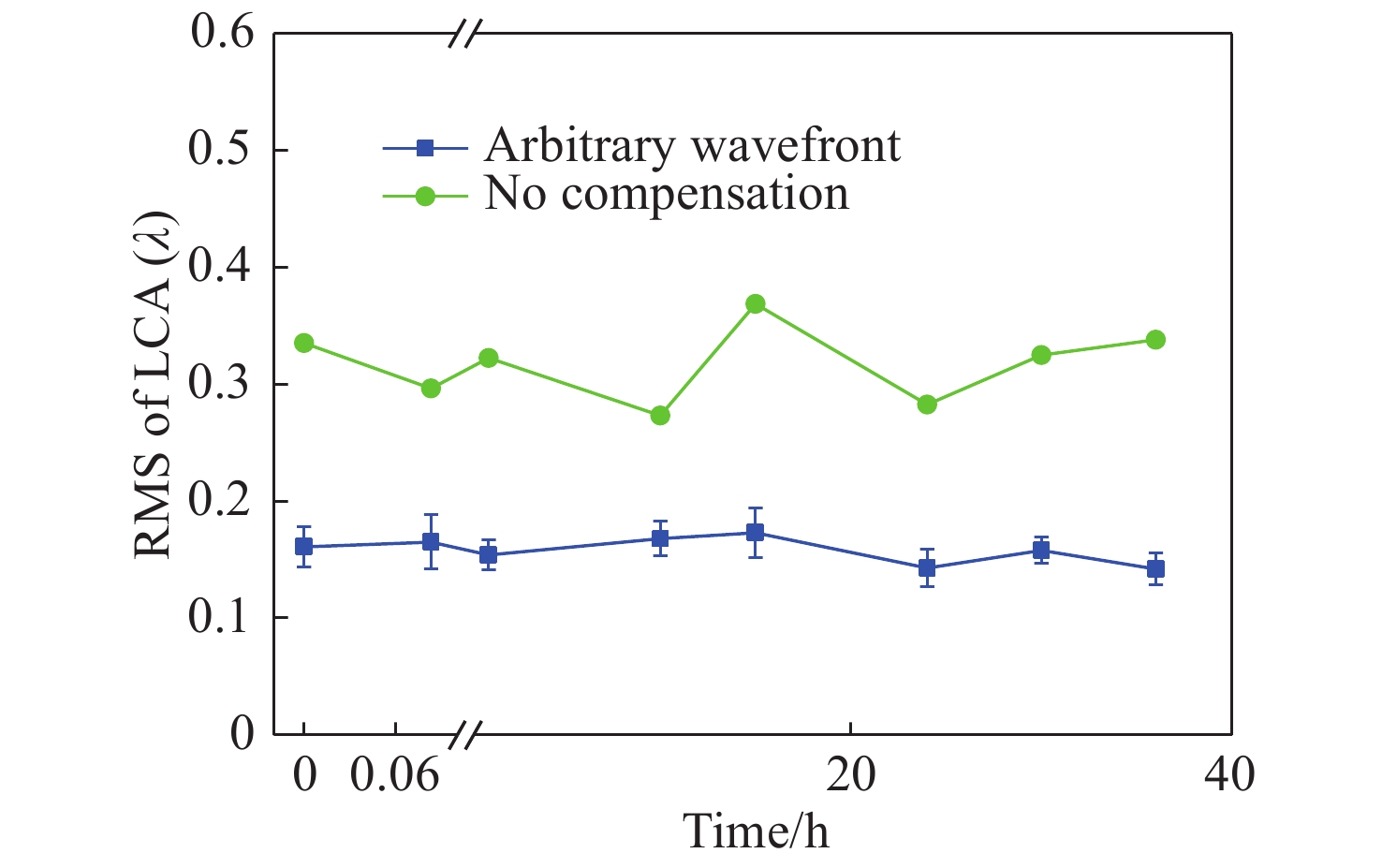 Dual-wavelength retinal imaging adaptive optics systems are suitable for high contrast and resolution imaging of retinal capillaries. The compensation of the Longitudinal Chromatic Aberrations (LCAs) in dual-wavelength adaptive systems is researched. The LCA is measured, the measured wavefronts are analyzed, and the arbitrary wavefront LCA compensation method is given. An adaptive correction experiment is carried out and the experimental results indicate that the root mean square error of the wavefront is reduced to 0.16 λ (λ=589 nm) and the retinal capillary resolution is improved to 6 μm. This work may be used for the clinical applications of retinal imaging.