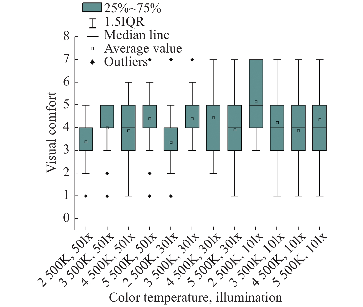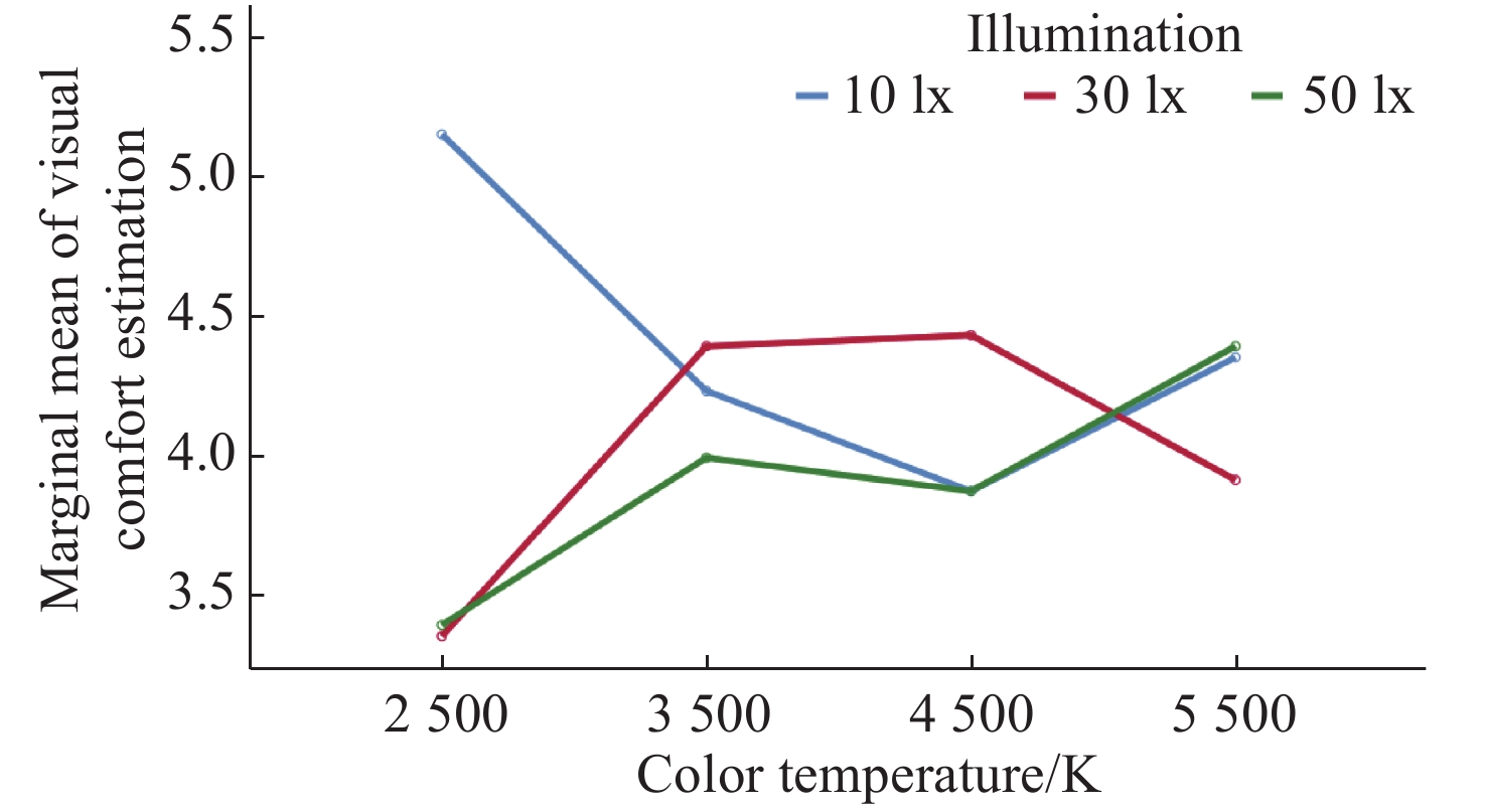 With the continuous development of digital display technology, display methods have also changed. Pepper’s ghost images that adopt modern display methods require the light environment of the exhibition space not only to ensure the effect but also ensure better visual comfort. In order to explore the influence of the lighting environment on the display effect based on Pepper’s ghost images, a virtual imaging display space is set up to analyze the factors and trends affecting the imaging effect, in which 12 sets of LED lighting conditions with different illuminances and color temperatures are generated. 25 observers are selected to conduct a psychophysical experiment. The experiment shows that color temperature has no significant effect on the evaluation of color authenticity, detail expressiveness and stereoscopic expressiveness for Pepper’s ghost images; illumination has no strong effect on the evaluation of the color authenticity of Pepper’s ghost images, but has a significant effect on their detail expressiveness and stereoscopic expressiveness. Under the lighting environment where the color temperature is 3500 K and the illumination is 10 lx, the detailed expressiveness and stereoscopic expressiveness of the display effect are relatively high and the visual comfort of 2500 K and 10 lx is better.
