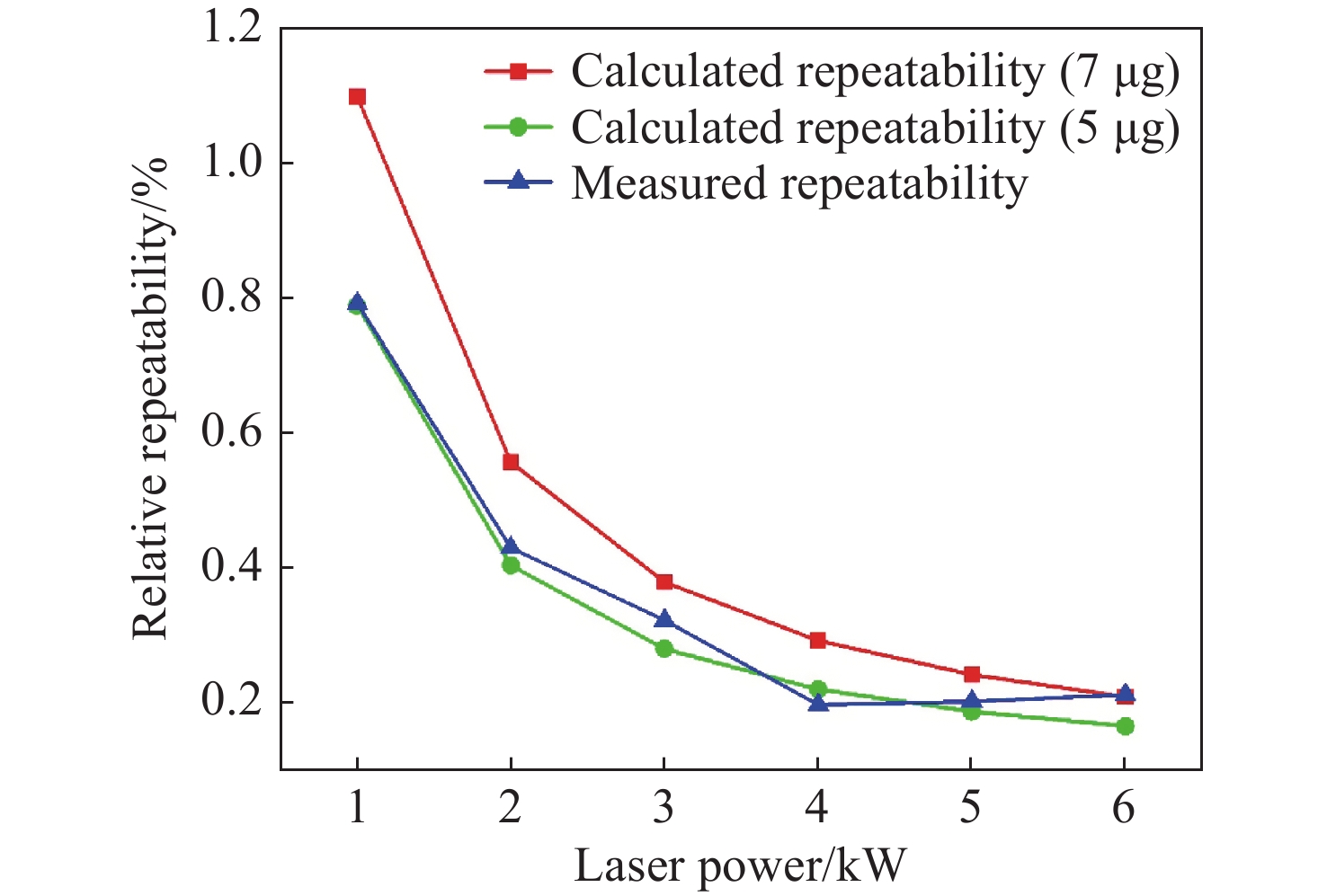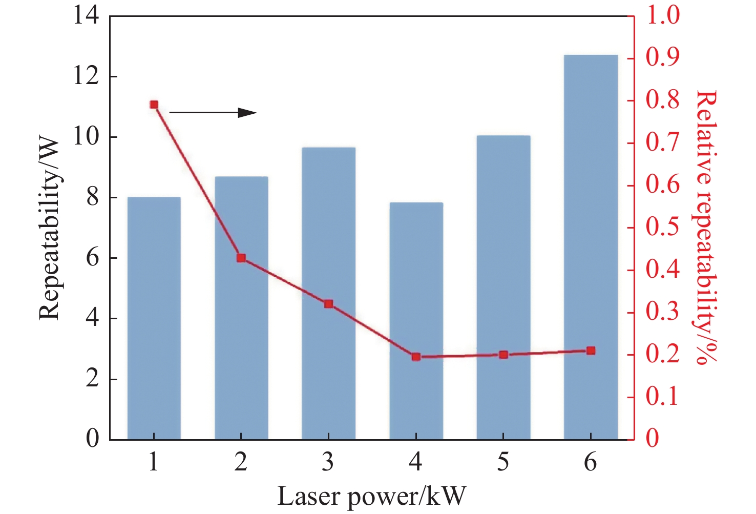 Measurement repeatability is the largest uncertainty component of a light pressure based measurement device, which directly affects the accuracy of the measurement results. In order to improve the accuracy of the measurement power in the process of high-power laser measurement, a high-power laser measuring device based on light pressure is built. Quality measurement repeatability and laser power measurement repeatability experiments were carried out, and the results of the two experiments were compared and analyzed. The experimental results show that the measurement repeatability of the light pressure measuring device gradually decreased with the increase of the measured mass and the measured laser power, indicating that the light pressure method has more advantages in measuring high-power lasers. In the laser power measurement repeatability experiment, the influence of eccentric loads and airflow disturbance is avoided, so the laser power measurement repeatability is better than the measurement repeatability calculated according to the equivalent mass. The research results have guiding significance for further improving the measurement accuracy of the light pressure method in the future.