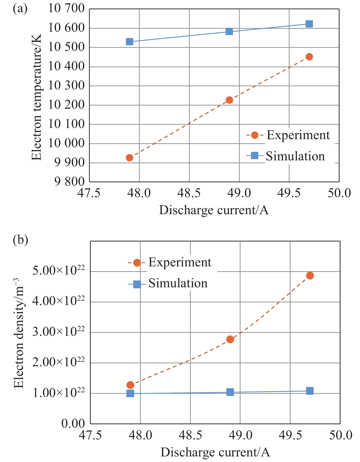 At present, the simulation research of arc actuators is limited to only obtaining the working characteristics of the plasma generated by the actuator, such as potential, pressure, temperature and velocity, while the plasma state is limited to only diagnosing its electron temperature and electron density by spectrum. The two are separated. This paper attempts to unify the two. Therefore, the arc jet plasma actuator designed here adopts the finite element method to solve the nonlinear multi physical equations. The working characteristics of the arc jet plasma actuator are numerically simulated, and the potential, pressure, temperature and velocity distributions inside the actuator are obtained. On this basis, the electron density is calculated and the simulation calculation model of the plasma state (electron temperature and electron density) of the actuator is obtained from the working condition of the actuator. Then the spectral diagnosis of the jet plasma is carried out by using the emission spectral diagnosis method, and the electron density of plasma is calculated by using the intensity ratio method of discrete spectral lines. The diagnostic experiment of the arc plasma actuator shows that the maximum electron temperature is 10505.8 K and the maximum electron density is 5.75×1022 m−3. For the plasma electron temperature and plasma density under different working conditions, the experimental and simulation results increase with the increase of inlet gas flow and discharge current. It shows that our simulation model of plasma state is reasonable and applicable for our miniaturized arc jet actuator with high jet velocity.