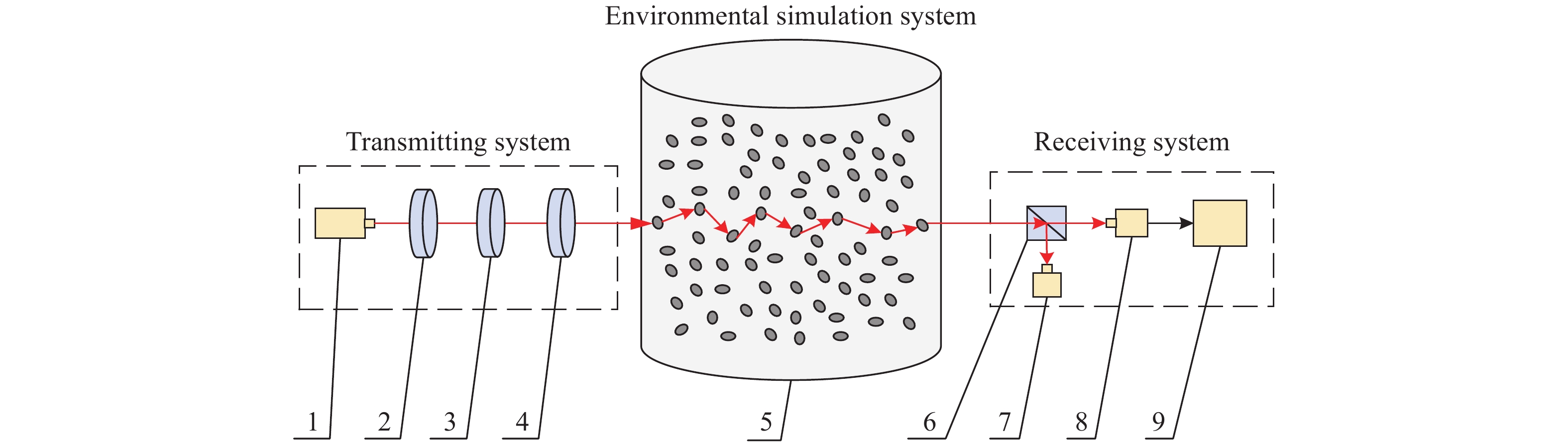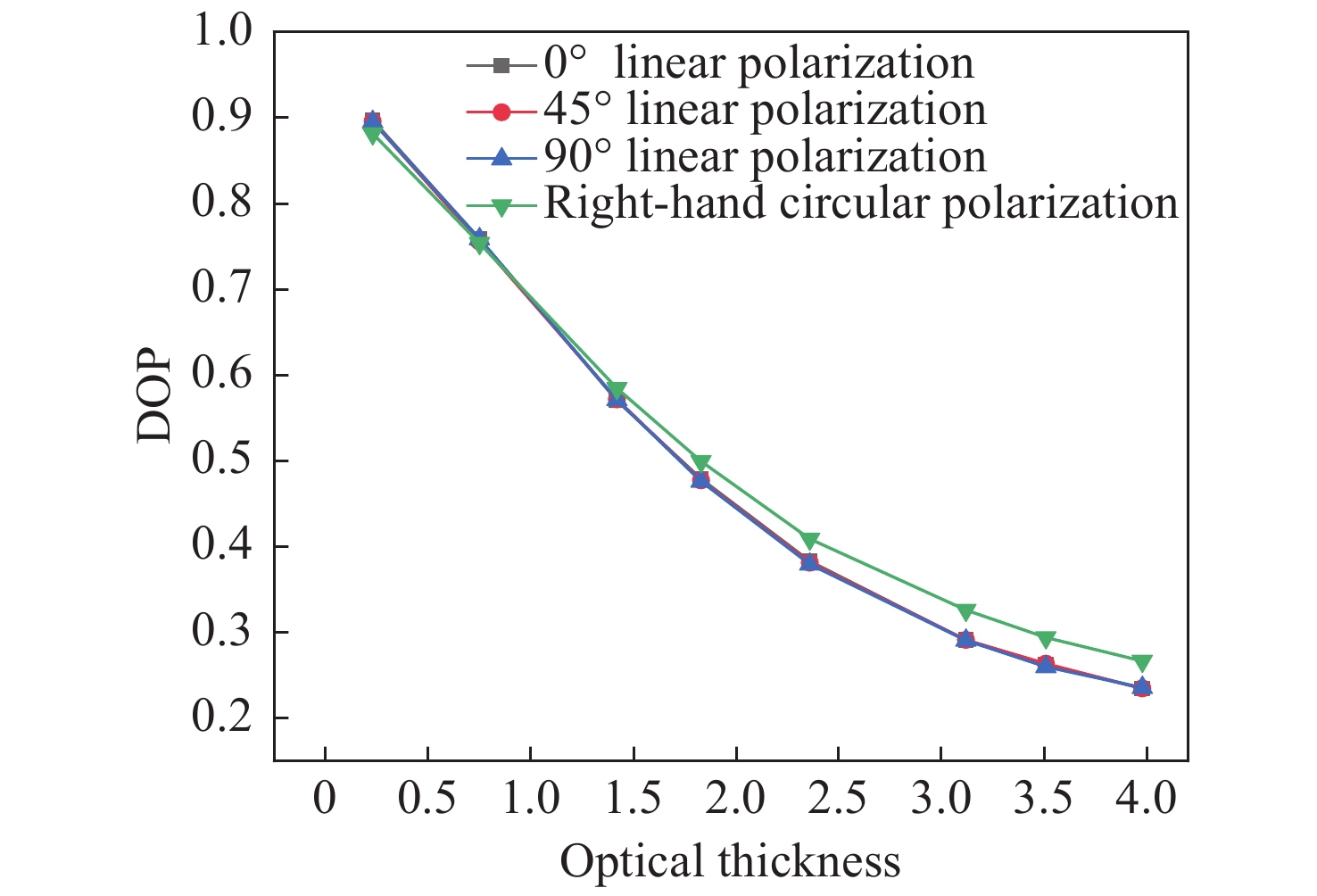 To investigate the multiple scattering transmission characteristics of polarized light in ellipsoidal fine particles, a simulation and experiment verification system for black carbon aerosol particles was established. The polarization transmission characteristic after multiple scattering of the randomly oriented ellipsoidal fine particles are studied by combining the T-matrix with the Monte Carlo method. A half-real simulation testing environment was established to verify the simulation algorithm, and the ellipsoidal fine particles were prepared by extending ganoderma lucidum spores′ burning time. The size distribution and optical thickness of the ellipsoidal fine particles were measured by Malvern Spraytec and a light power meter, respectively. The simulation results can be proven by combining the experiment with the simulation. The results show that with an increase in the concentration of black carbon ellipsoidal fine particles, the Degree Of Polarization (DOP) of the horizontal, vertical, 45° linearly polarized and the right circularly polarized light all decrease, and the polarization preservation ability of three kinds of linear polarizations are basically consistent. The polarization preservation ability of the circularly polarized light gradually exceeds the linearly polarized light with an increase in concentration. The gap between the linear and circular polarizations becomes larger as it reaches its maximum value at 3.12 optical thickness. When the optical thickness is greater than 3.12, the DOP difference between the circularly and the linearly polarized lights tend to be stable. By calculation, the percent agreement between the simulation and the experiment is better than 70.84%. These results can expand the environmental applicable range of polarization detection and provide theoretical support for studying the polarization detection of atmospheric non-spherical particles.