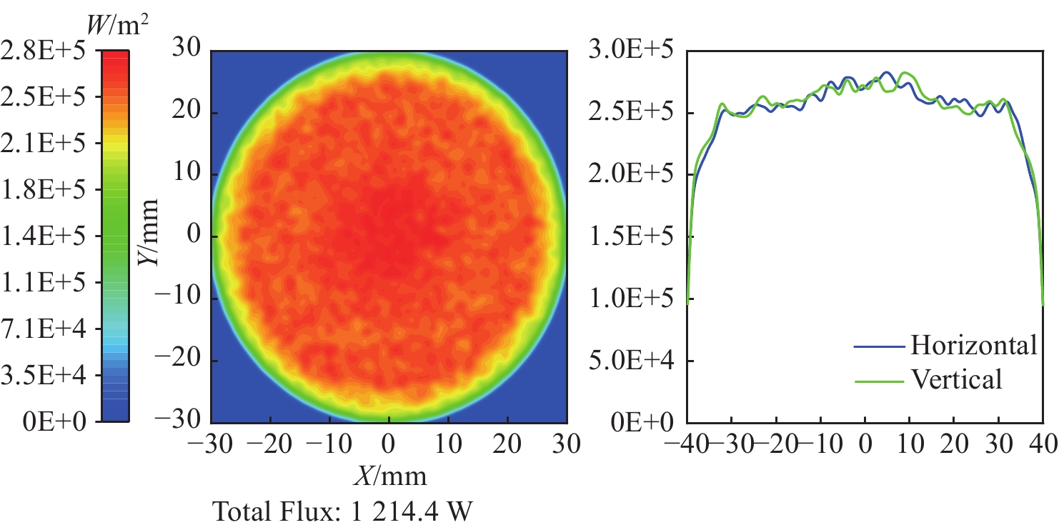 The concentrating solar simulator can obtain solar radiation spots with high-power convergence, which has important applications in the fields of solar thermal power generation and thermochemical research. To obtain uniform solar radiation spots, a free-form surface condenser design method based on non-imaging optics is proposed, and its design principle and specific method are described. The designed free-form condenser is compared with a non-coaxial ellipsoidal condenser with the same containment angle, and the correctness of its design method is verified by simulation analysis. The simulation results show that when a xenon lamp with a rated power of 6 kW is used as the light source, the single-lamp solar simulator composed of a free-form condenser can produce a spot with an average irradiance of 274.4 kW/m2 in the target region with a diameter of 60 mm. The spot’s unevenness decreases from 18.28% to 5.69% compared with that of a non-coaxial ellipsoidal solar simulator. The seven-lamp solar simulator can produce a spot with an average irradiance of 1.65 MW/m2, with a spot unevenness that decreases from 13.19% to 5.49%.