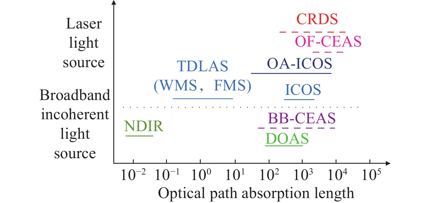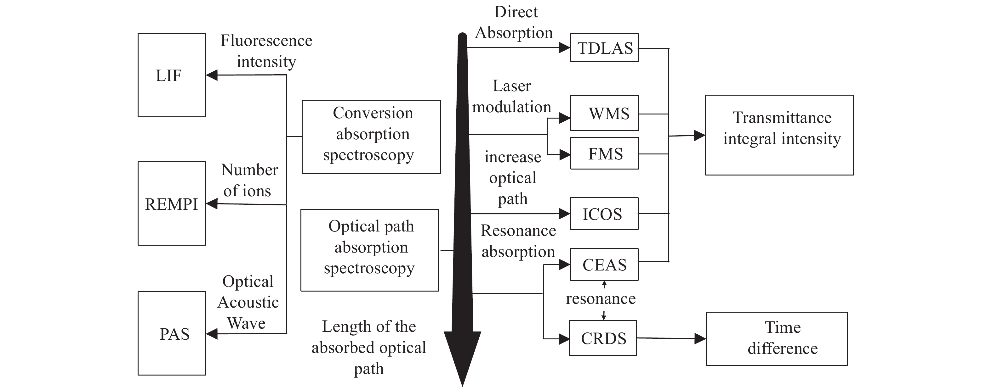 Optical path absorption spectroscopy is an important branch of absorption spectroscopy. In recent years, there has been a proliferation of optical path absorption spectroscopy techniques based on different light source technologies, absorption cavity technologies, and detection methods. As the demands on detection sensitivity and absorption optical path length increased, optical path absorption spectroscopy techniques based on the principle of enhanced absorption emerged, including integrated cavity spectroscopy (ICOS), cavity-enhanced absorption spectroscopy (CEAS) and cavity ring-down spectroscopy (CRDS). Enhanced absorption spectroscopy is advantageous for its high spectral resolution, high sensitivity, fast response time, and portability, but it presently lacks a unified concept and clear classification criteria. This paper compares the development history of absorption spectroscopy techniques and clarifies the concept of their multi-optical path. Based on whether resonant absorption occurs in the absorption cavity, the concept of absorption spectroscopy techniques based on resonance is proposed, and the current research status of resonant absorption spectroscopy techniques is analyzed and summarized, and the applications of this technique in various fields are outlined. Finally, the future development of key technologies in resonance absorption spectroscopy is envisioned.