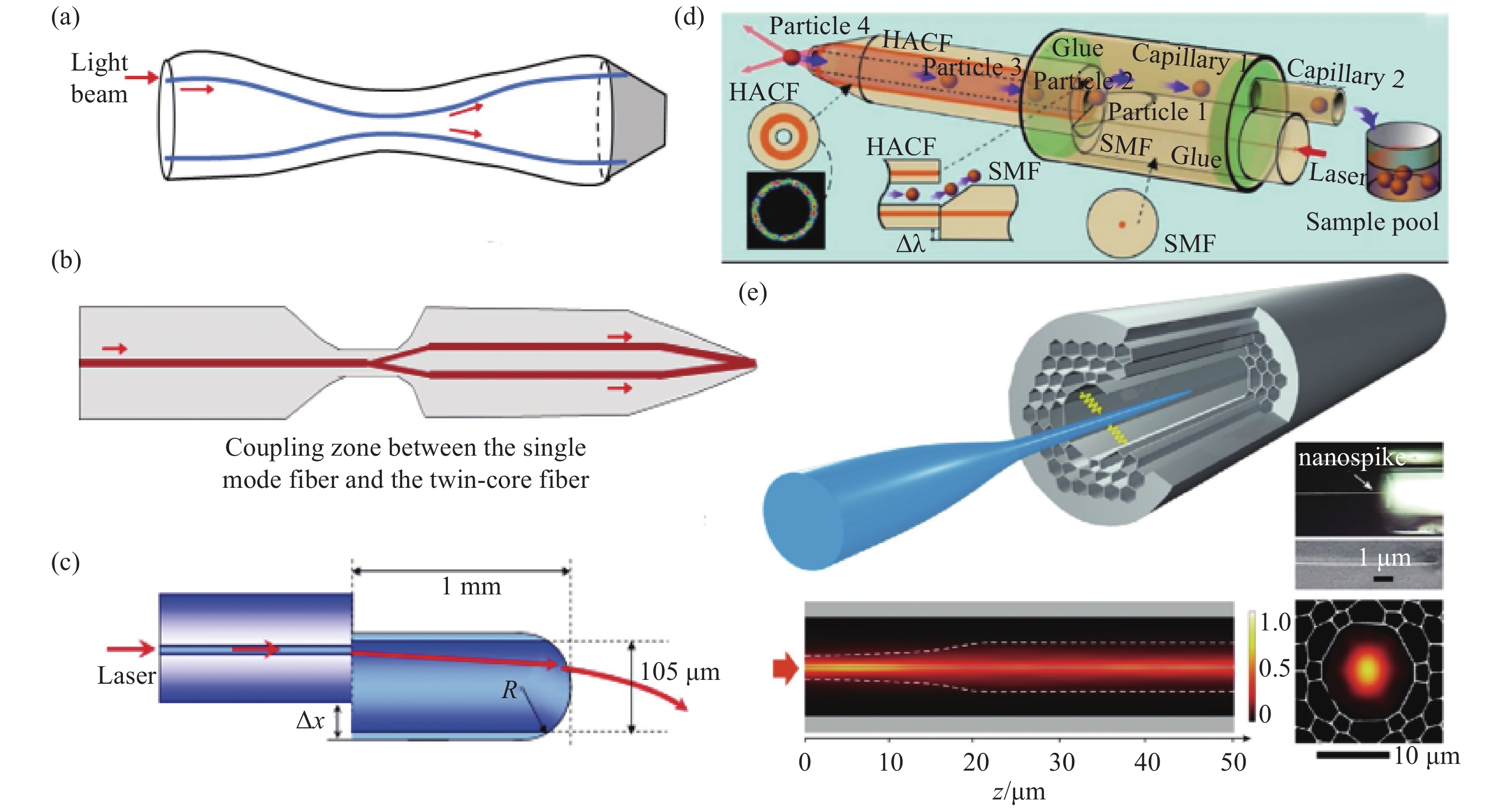 Optical fiber tweezers are widely used in biochemical analysis, life sciences, and other fields due to their simple structure, flexible operation, and compact size. The hetero-core structure of the optical fiber probe possesses inherent advantages in near-field evanescent wave optical trapping force, core beam coupling transmission, and cross-synergistic application of microfluidic technology, which can realize the functions of cell and subcellular particle collection and transportation, and can significantly improve the three-dimensional particle trapping capability as well as dynamic manipulation level. In this paper, the structural characteristics and application technology research progress of optical fiber tweezers based on different core structures are reviewed. This paper sorts and compares key technologies, including probe preparation, laser source, and coupling mode, in hetero-core optical fiber tweezers systems. It also summarizes and provides a perspective on the role and development of hetero-core fibers with different structures in optical fiber tweezers.