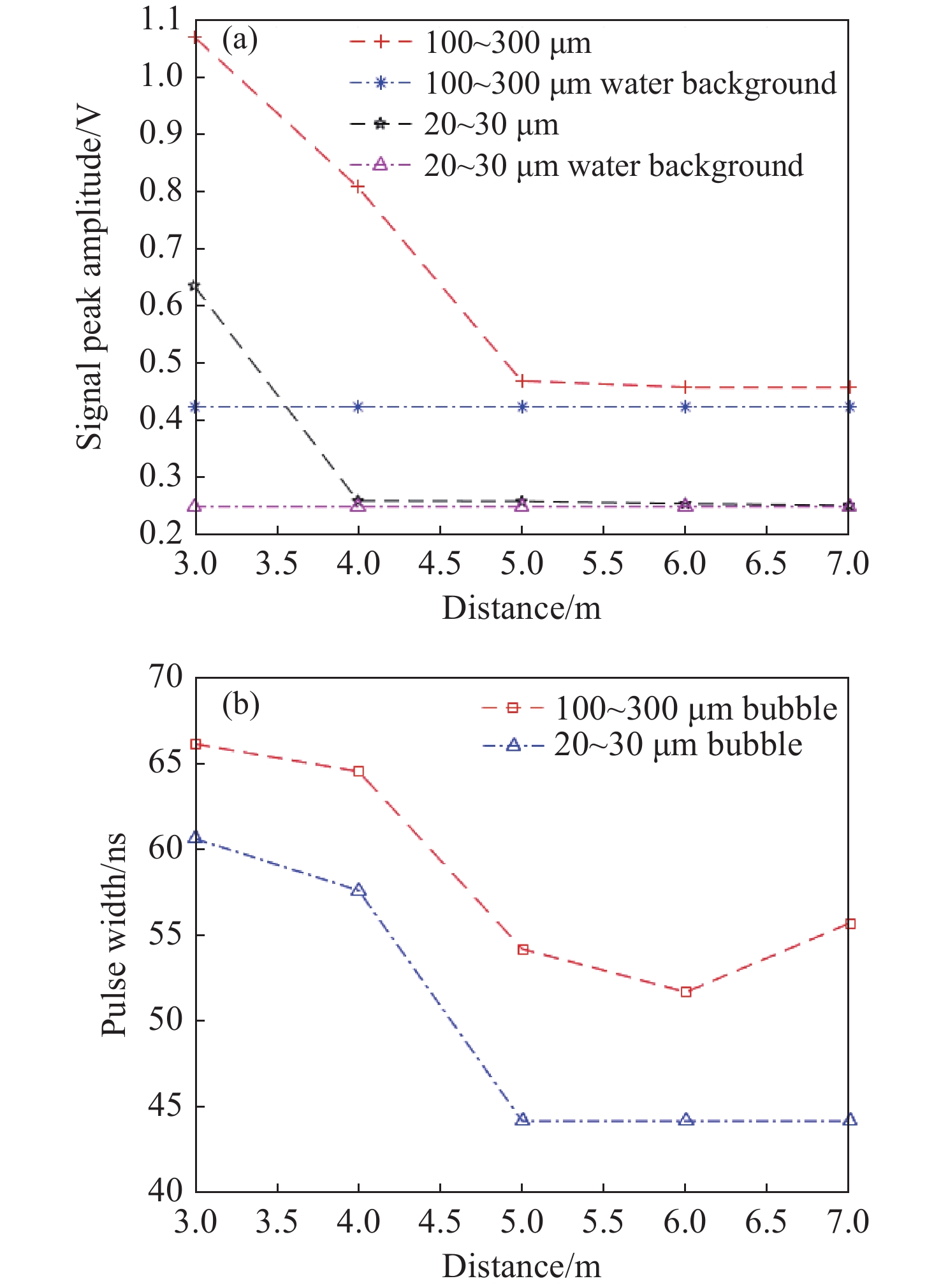 In order to improve the laser wake guidance distance and the detection signal-to-noise ratio, it is of great theoretical and practical value to study the backscattering characteristics of bubble targets with different distances, bubble sizes, bubble number densities, and bubble layer thicknesses. The laser backscattering characteristics of ship wake bubble targets with different distances, scales, numerical densities, and thicknesses are studied using Monte Carlo simulations and indoor experiments. When the bubble density is 102−108 m−3 and the thickness of the bubble layer is greater than 0.05 m, there is always an echo signal for both large- and small-scale bubbles. When the thickness of the bubble layer is less than 0.05 m, no echo signal is detected. At this situation, the thickness of the bubble layer is the greatest impact factor on the backward scattering of bubbles. When the bubble number density is 109 m−3 and the thickness of the bubble layer is below 0.05 m, the pulse width of the large-scale bubble echo signal widens. The number density and scale characteristics of the bubbles have the greatest impact on the backscattering of bubbles. A laser backscattering measurement system at the scale of typical underwater bubbles is built to verify the influence of different ship wake bubble characteristics on the laser backscattering detection system, which can provide support for the ship wake laser detection project.