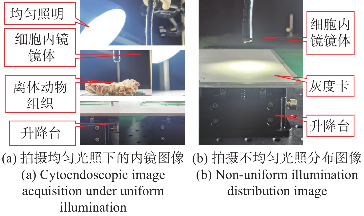 Cytoendoscopy requires continuous amplification with a maximum magnification rate of about 500 times. Due to optical fiber illumination and stray light, the image has non-uniform illumination that changes with the magnification rate, which affects the observation and judgement of lesions by doctors. Therefore, we propose an image non-uniform illumination correction algorithm based on the illumination model of cytoendoscopy. According to the principle that image information is composed of illumination and reflection components, the algorithm obtains the illumination component of the image through a convolutional neural network, and realizes non-uniform illumination correction based on the two-dimensional Gamma function. Experiments show that the average gradient of the illumination channel and the discrete entropy of the image are 0.22 and 7.89, respectively, after the non-uniform illumination correction by the proposed method, which is superior to the traditional methods such as adaptive histogram equalization, homophobic filtering, single-scale Retinex and the WSI-FCN algorithm based on deep learning.