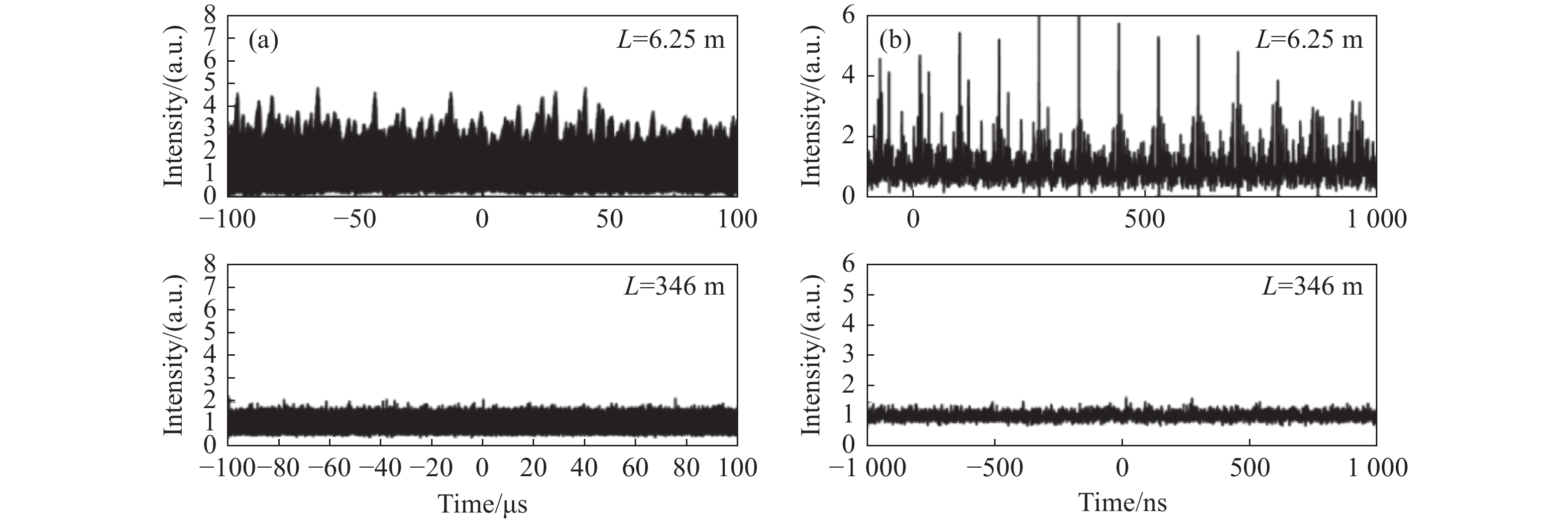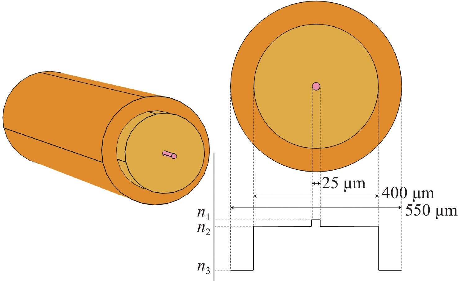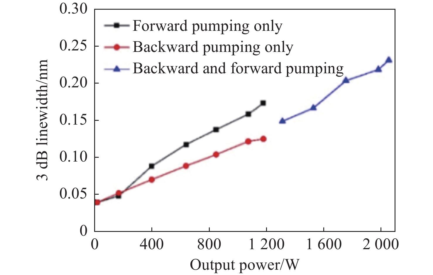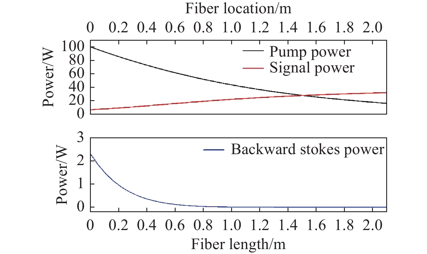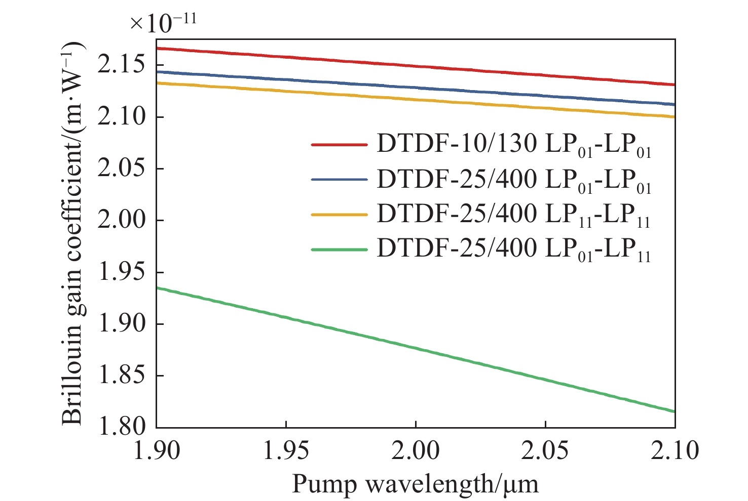 In this paper, the effect of Stimulated Brillouin Scattering(SBS) on the laser output performance in a 2 µm thulium-doped fiber amplifier was analyzed theoretically. The optical mode distribution, the effective refractive index, the effective mode field area, and the normalized frequency of the double-clad thulium-doped fiber at 793 nm pump wavelength and 1.9−2.1 µm laser waveband were studied. The stimulated Brillouin scattering characteristics, including the Brillouin frequency shift and the Brillouin gain spectrum, in the double-clad thulium-doped fiber were numerically simulated in the laser waveband of 1.9−2.1 µm. The influence of stimulated Brillouin scattering on the laser output performance of thulium-doped fiber amplifiers was investigated using the theoretical model of stimulated Brillouin scattering in gain fibers. In the DTDF-10/130 double-clad thulium-doped fiber, a continuous wave with power of 100 W and wavelength of 793 nm is used as a pump to amplify a continuous signal wave with wavelength of 2 µm and power of 0.01 W. The maximum output powers of the signal wave are 25.27 W, 31.08 W and 34.06 W when the pump power filling factors are 0.01, 0.02 and 0.03, respectively. The corresponding optimal double-clad fiber lengths are 2.66 m, 2.02 m and 1.75 m. Additionally, the Stokes optical powers generated by the stimulated Brillouin scattering are 1.68 W, 1.39 W and 1.14 W, respectively. The results show that the double-clad fiber with large pump power filling factor in the thulium-doped fiber amplifier can effectively reduce the fiber length, thus to minimize the influence of stimulated Brillouin scattering on the output power of the signal laser. The numerical model can optimize the fiber length of the fiber amplifier, which is of great significance to improve experimental efficiency and reduce experimental costs.