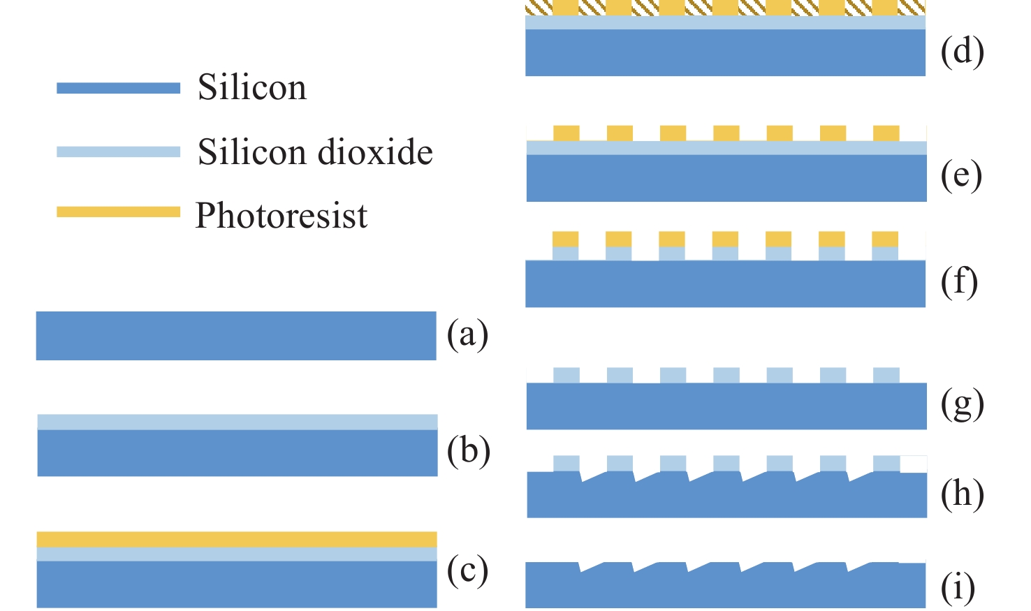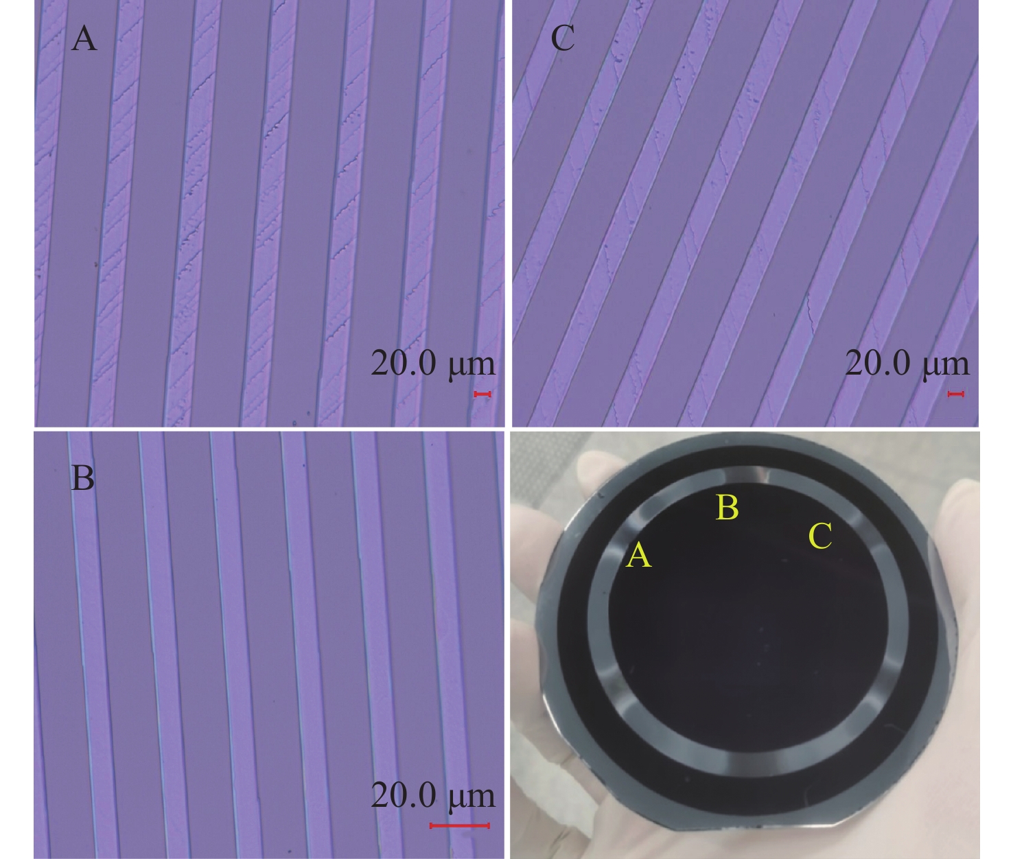 In order to meet the requirements of the national synchrotron radiation source, the anisotropic wet-etching technology of monocrystalline silicon grating with small blazed angle is studied, and the blazed grating suitable for the medium wave soft X-ray band is prepared. Based on the rigorously coupled wave theory, the structural parameters and process tolerance of the small blazed angle grating are designed. In the crystal alignment process, the crystal orientation of the silicon wafer is determined by ring-preetching, and then the grating mask is aligned with the crystal direction of monocrystalline silicon <111> based on the frequency doubling adjustment method. At the same time, the effect of the photoresist ashing technique and the active agent on the groove quality of the grating is investigated, and the scintillating gratings close to the ideal sawtooth groove shape are successfully prepared by the monocrystalline silicon anisotropic wet etching process. The experimental results show that the blazed angle of the prepared grating is 1°, the linear density is