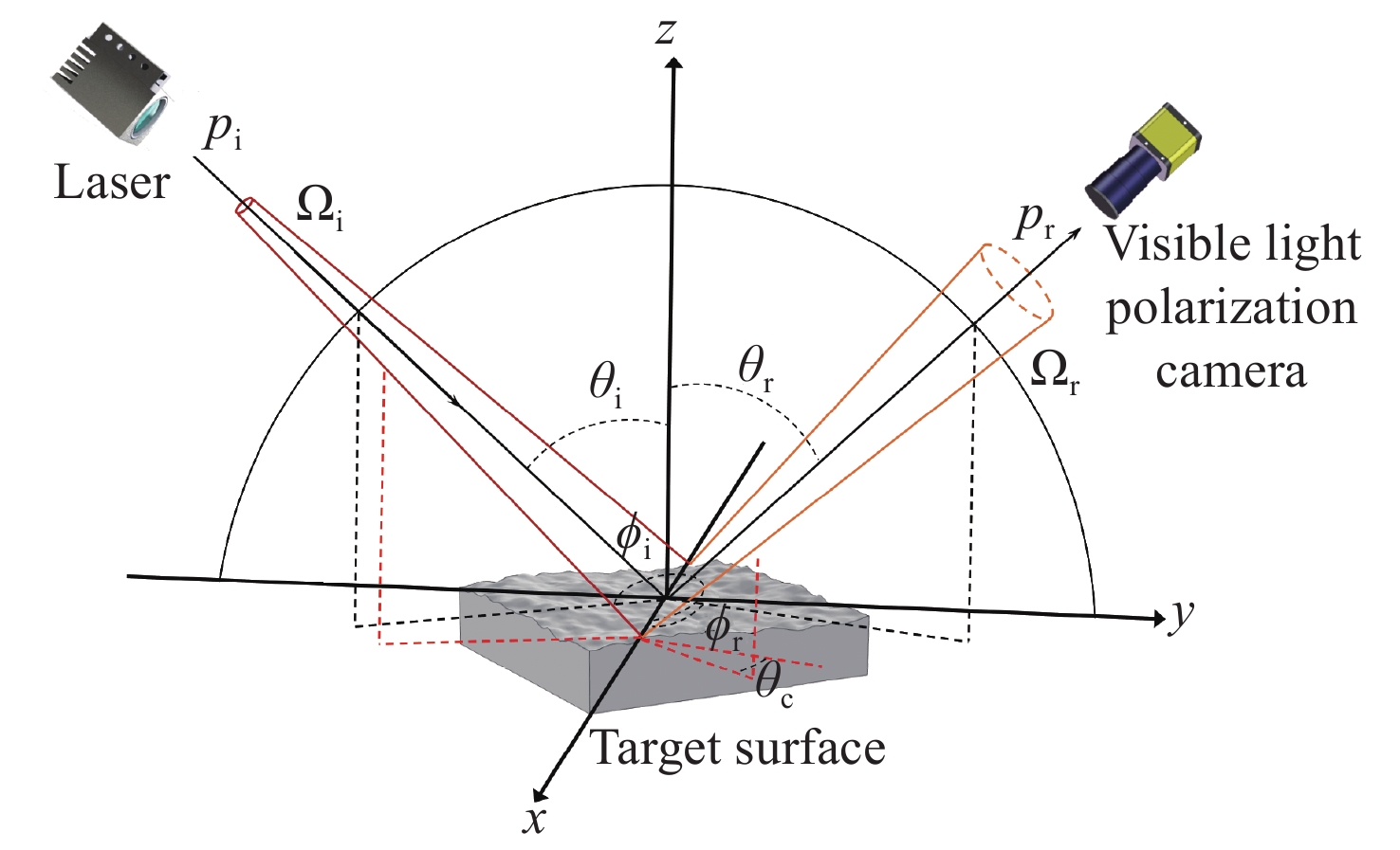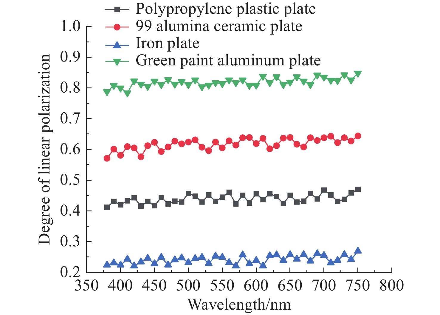Focusing on the visible polarization reflection characteristics of typical target materials surfaces, the polarization bidirectional reflection distribution function model based on the improved Blinn masking function was established considering the effects of specular reflection, diffuse reflection and volume scattering, which maked up for the defect of traditional "V" masking function. The physical parameters of the target materials were inverted by genetic algorithm, and the visible light polarization characteristics of four target materials, namely polypropylene, 99 alumina ceramic, iron and green painted aluminum, were simulated. Experimental tests validate the model’s accuracy. Results indicate that at an incidence angle of 50°, relative azimuth angles of 90°−270°, and detection angles of 0°−60°, the improved model reduces the root mean square error (RMSE) by 70.61% to 24.73%, with a minimum RMSE of 0.0129. Significant polarization is observed at relative azimuth angles of 120°−240°. The larger the ratio of the real part to the imaginary part of the complex refractive index of the four materials, the greater the peak value of the degree of polarization. In the visible light band, the wavelength has little effect on the degree of polarization. These findings provide theoretical data supporting the understanding of polarization characteristics in typical target materials.