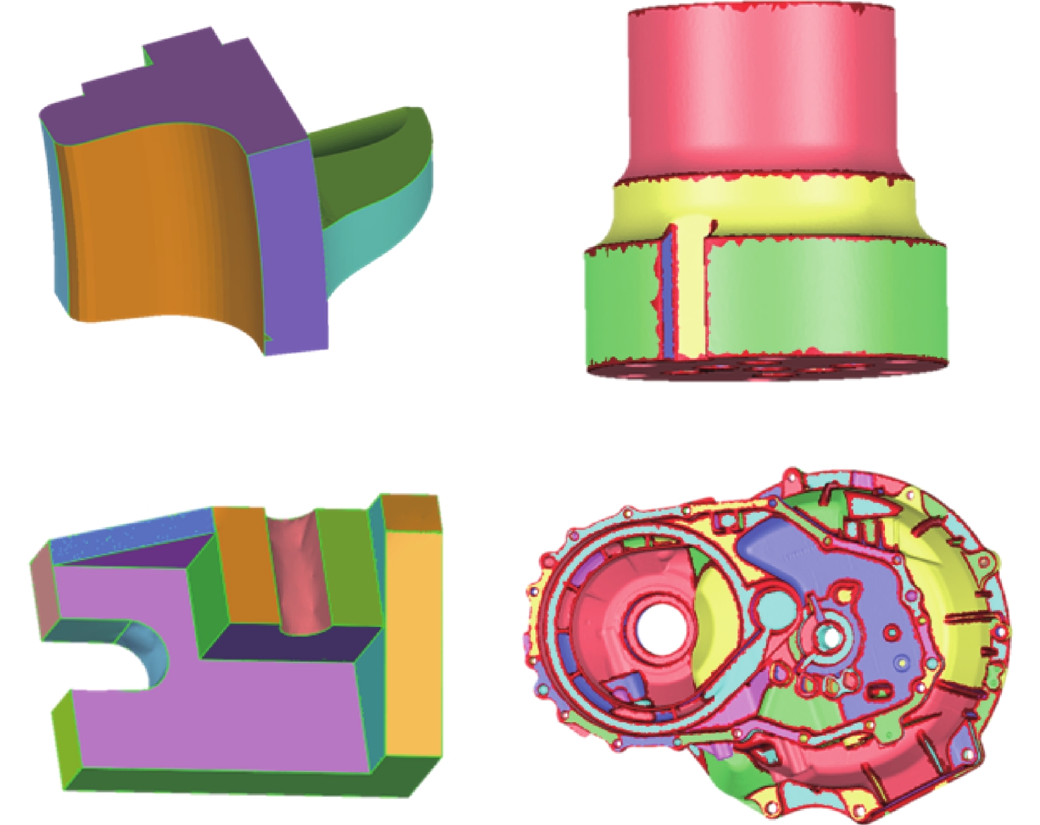 Triangular mesh model registration is an important part of industrial automation detection software. The registration accuracy has an important influence on mechanical parts' shape and position tolerance. Aiming to solve the problems of low accuracy and poor robustness of the automatic registration of triangular mesh models, we propose a segmentation method for enhanced features in the automatic registration of triangular mesh models for mechanical parts. First, the K value of the feature segmentation of the triangular mesh model was determined, and the Laplacian matrix determined the seed points for iterative initialization. Second, the appropriate region shape agent and cost function were used to accelerate the process and perform multi-source iterative clustering to obtain the intended feature segmentation results. Finally, based on the feature segmentation results of the triangular mesh model, the coarse registration based on the singular value decomposition method was performed, then the fine registration was performed according to the EM-ICP. The experimental results show that the proposed method reduces registration error by 25.2% and shortens the automatic registration time by 62.6%, compared with the traditional feature descriptor coarse registration combined with ICP fine registration method. This effectively improves the accuracy and efficiency of the automatic registration of the triangular mesh model.