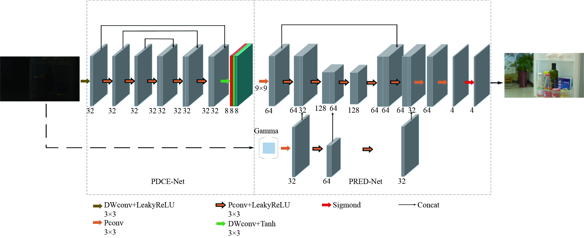 In order to solve the problems of low image exposure, low contrast and difficulty of feature extraction in real-time animal monitoring at night, we proposed a lightweight self-supervised deep neural network Zero-Denoise and an improved YOLOv8 model for image enhancement and accurate recognition of nocturnal animal targets. The first stage of rapid enhancement was performed by lightweight PDCE-Net. A new lighting loss function was proposed, and the second stage of re-enhancement was carried out in PRED-Net based on the Retinex principle and the maximum entropy theory, using the original image and fast enhancement image corrected by the parameter adjustable Gamma. Then, the YOLOv8 model was improved to recognize the re-enhanced image. Finally, experimental analysis was conducted on the LOL dataset and the self-built animal dataset to verify the improvement of the Zero-Denoise network and YOLOv8 model for nocturnal animal target monitoring. The experimental results show that the PSNR, SSIM, and MAE indicators of the Zero-Denoise network on the LOL dataset reach 28.53, 0.76, and 26.15, respectively. Combined with the improved YOLOv8, the mAP value of the baseline model on the self-built animal dataset increases by 7.1% compared to YOLOv8. Zero-Denoise and improved YOLOv8 can achieve good quality images of nocturnal animal targets, which can be helpful in further study of accurate methods of monitoring these targets.