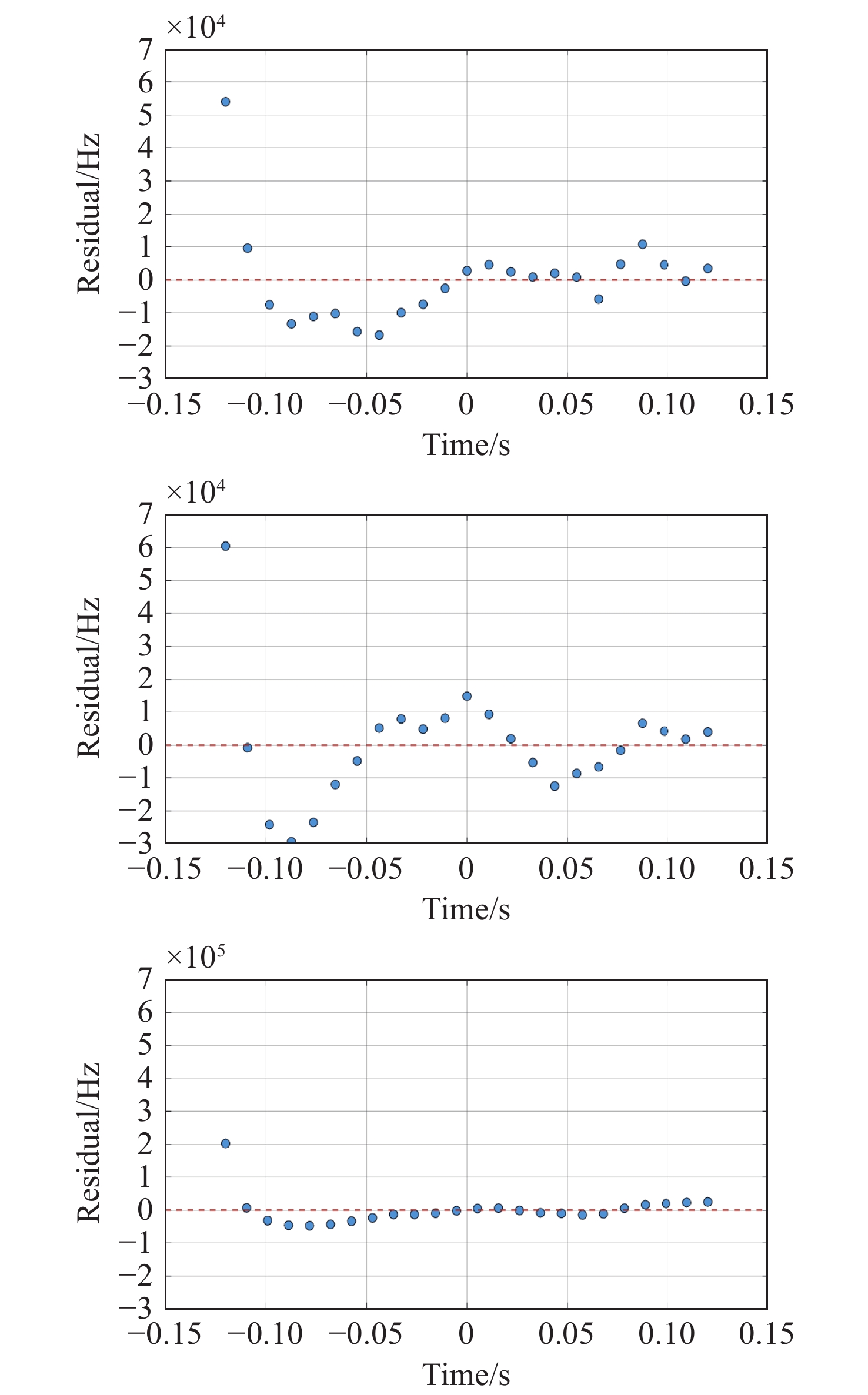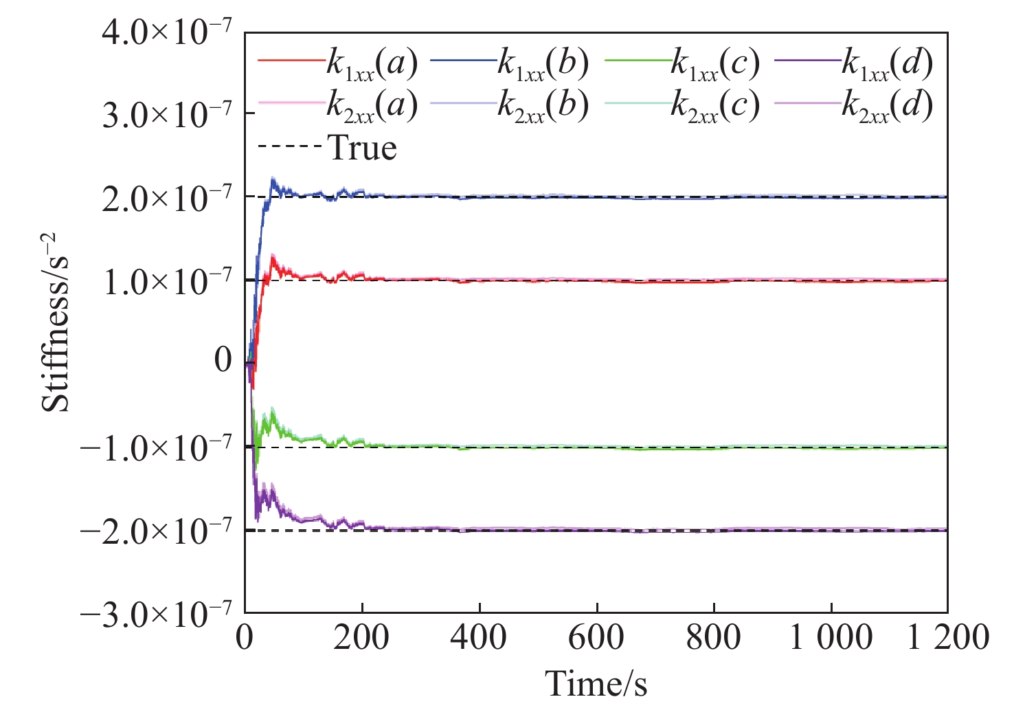 The coupling noise between test mass stiffness and displacement, as a significant component of the residual acceleration noise, critically impacts the performance of space gravitational wave detection, making stiffness identification essential for validating and optimizing control strategies and meeting the noise suppression requirements. For non-coaxial test mass configurations, this paper proposes a novel identification method based on dual sensitive axis decomposition. First, a relative dynamic model between the test mass and the spacecraft is constructed, and the model parameters are decomposed along the dual sensitive axis to isolate the influence of spacecraft acceleration disturbances and predominant angular acceleration disturbances on the on-orbit identification. Second, utilizing on-board laser interferometers, inertial sensors, and associated control loops, an on-orbit identification scheme is designed and a stiffness identification method using recursive least squares is proposed. Finally, numerical simulations are performed to verify the performance of the method. The experimental results demonstrate that the proposed stiffness identification method can effectively identify the stiffness of the test mass on the sensitive axis. Under the given simulation conditions, the mean absolute error is less than 5×10−9 s−2, the root mean square error is less than 1.5×10−8 s−2, and the maximum steady-state error is less than 2×10−9 s−2. These findings suggest that the method can be applied to future gravitational wave science missions.