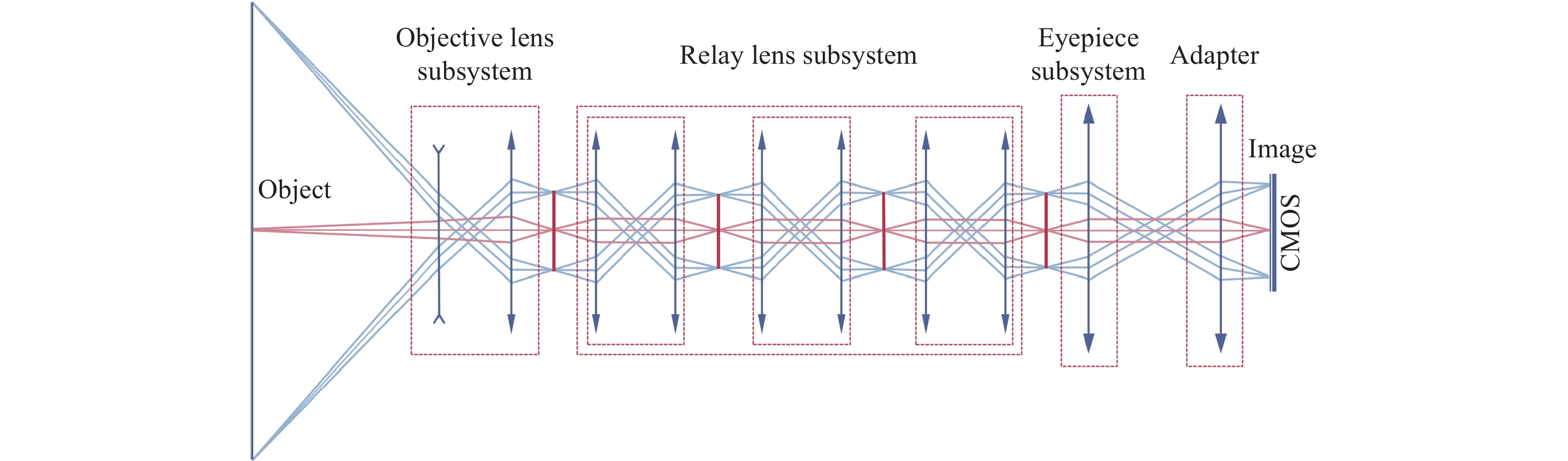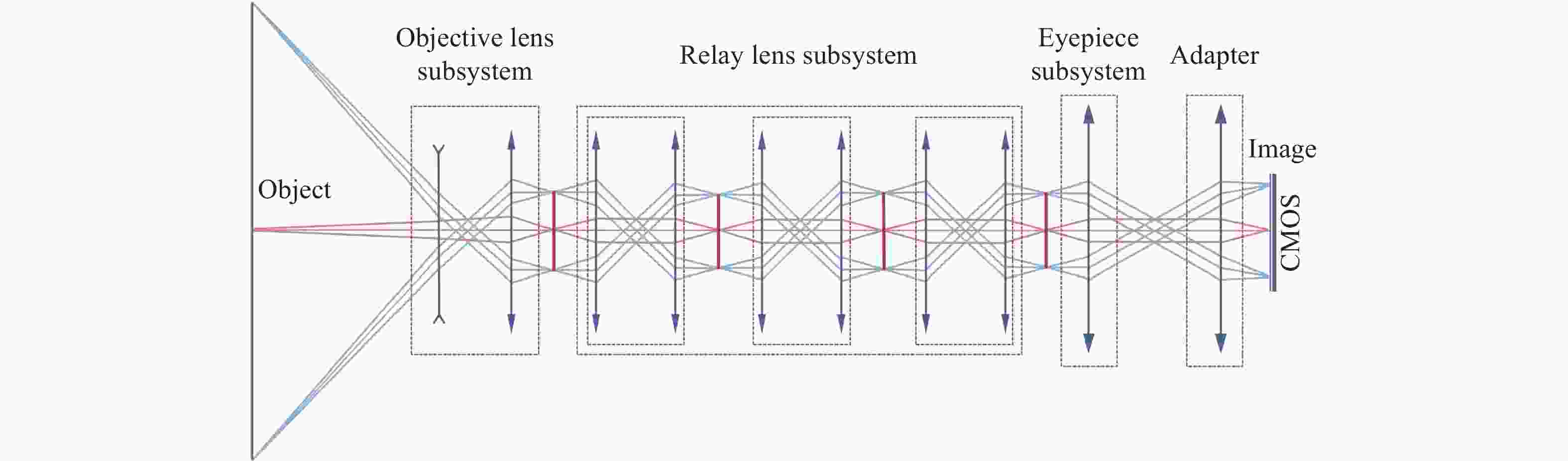 为提升关节内窥镜在临床手术中的成像性能并拓展其应用前景,设计了一种兼具大视场与高分辨率、可见光与近红外宽光谱齐焦成像特性的关节内窥镜光学系统。物镜通过大光焦度负透镜压缩主光线角度、减小轴外与轴上光线的光程差;并利用光阑共轭成像在转向棱镜内形成等效虚拟光阑,以在有限口径下兼顾大视场下的通光效率与高像质。中继镜采用三级近对称结构,通过光焦度与阿贝数分配有效抑制宽光谱传像过程中的轴向色差累积,从而实现齐焦成像。经公差分析表明,该系统具有良好制造与装调可实现性。实验结果验证了所设计的宽光谱关节内窥镜在95°视场角下可实现可见光与近红外波段齐焦成像,角分辨力分别为4.34 C/(°)和2.74 C/(°),光学系统为低成本实现高性能荧光内窥镜提供了可行方案,具备重要的应用价值。