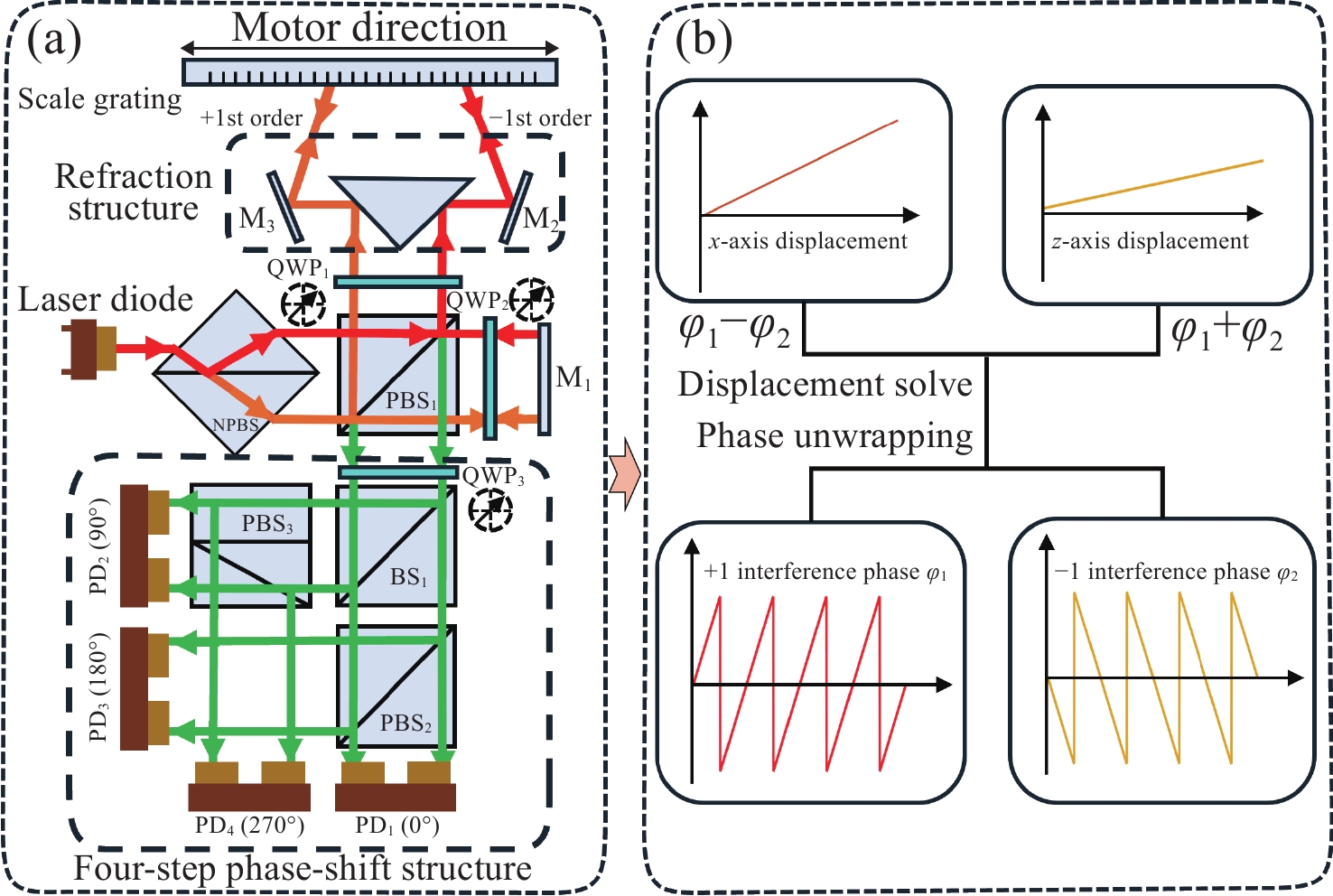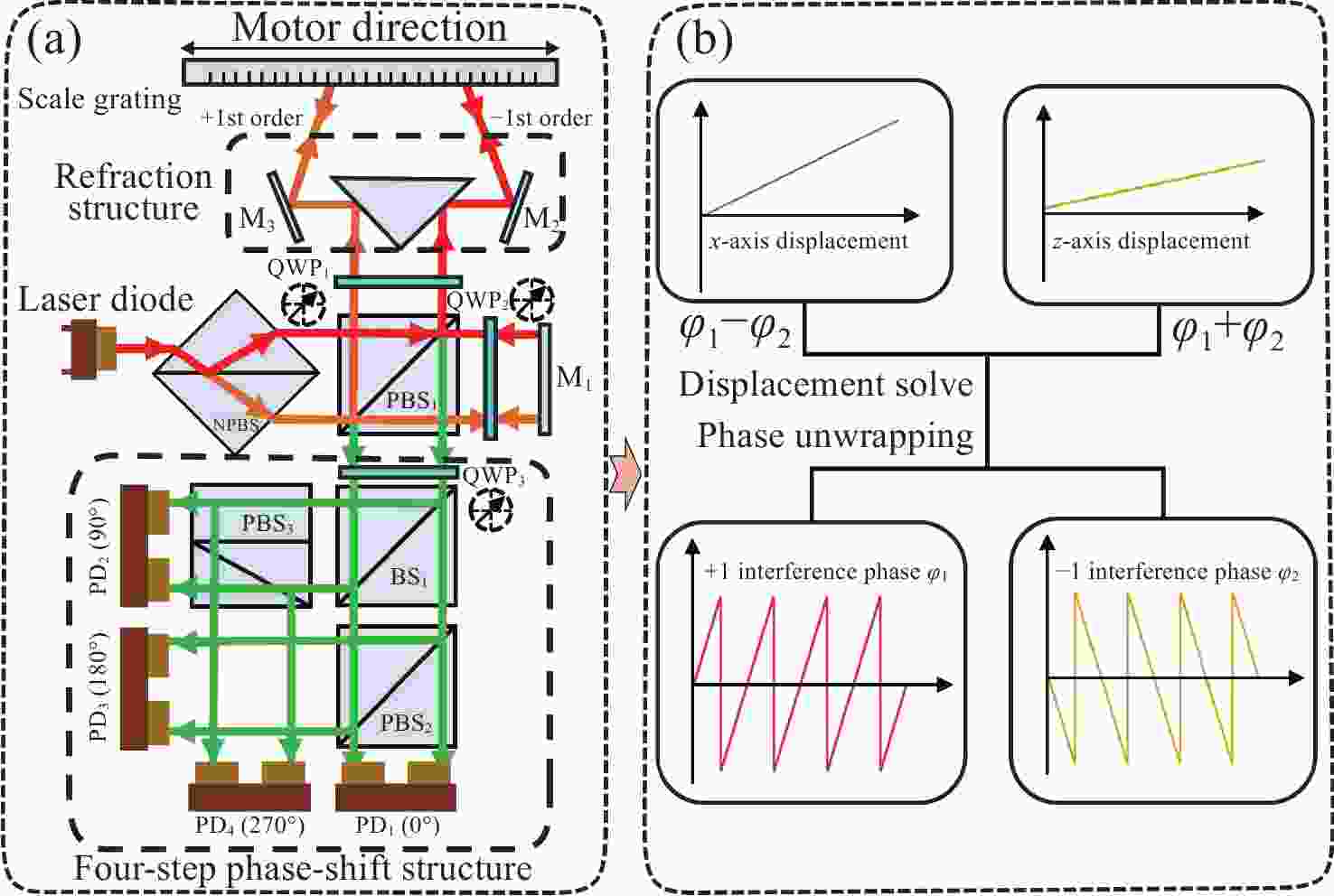 干涉的相位映射关系,通过任意两次位移获取的干涉相位信息,即可解算上述3项参数,同时又可获取光栅安装误差。使用